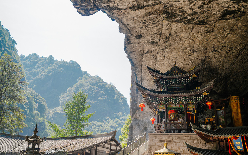 而这里还有个悬崖凹进去行程的山洞,里面修了一座小庙,可谓峻险,脚踏着栈道,头顶着压迫感十足的岩壁,绝对难忘!