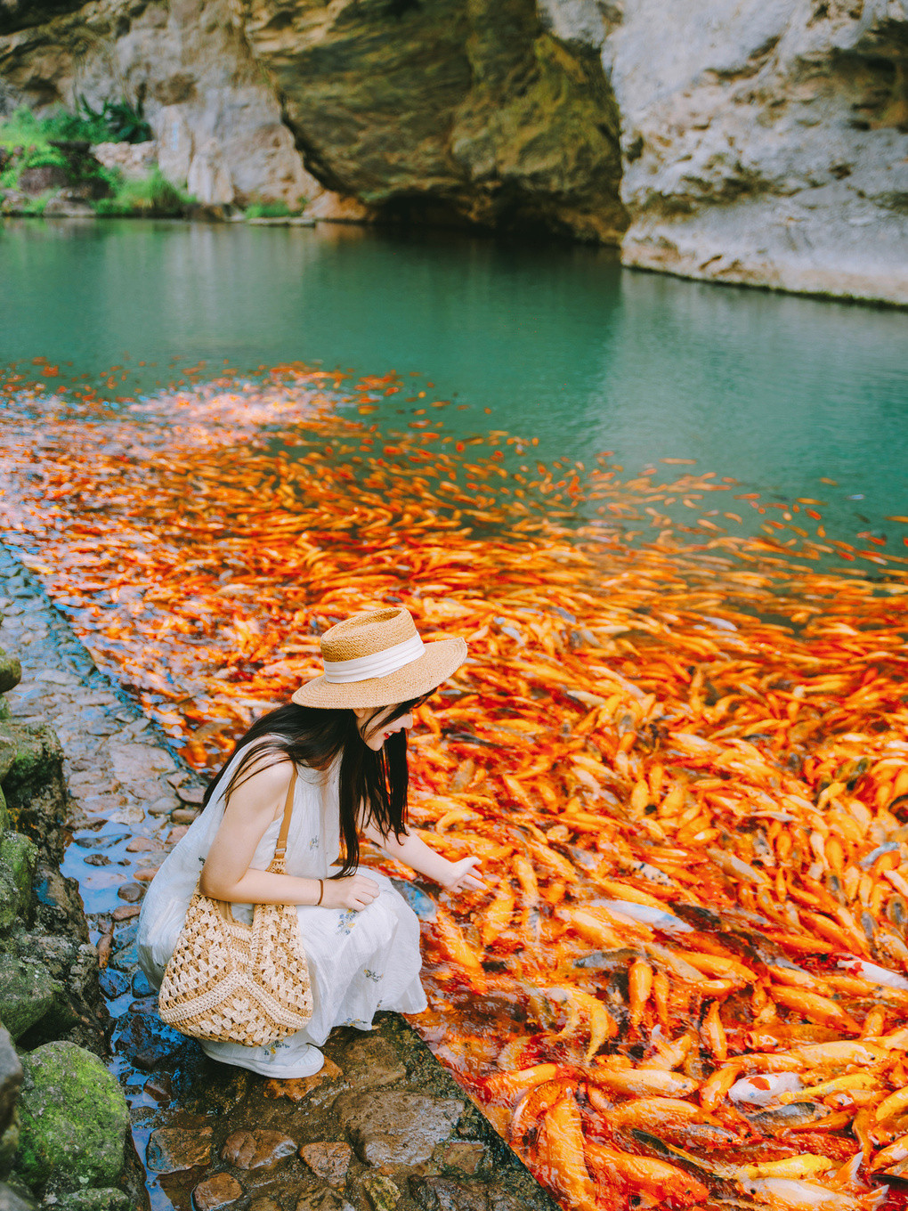 有意思的是带点鱼食瞬间就能吸引一大波锦鲤哦~