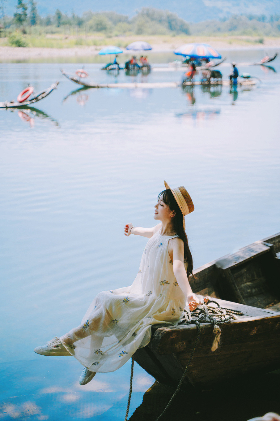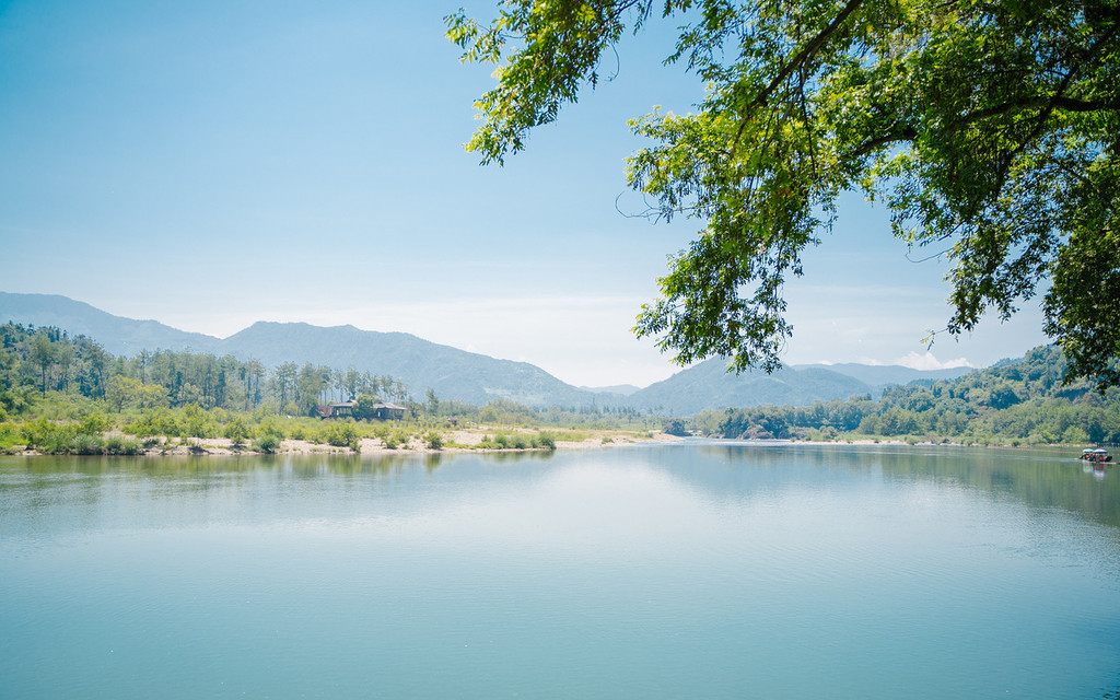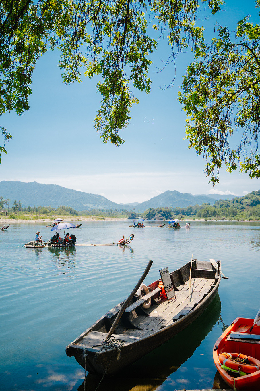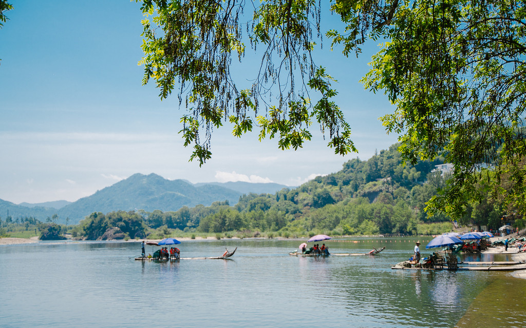 坐在筏中的竹椅子上,兴致来了,你也可以脱掉鞋子,把脚伸入水中,细数脚边和竹筏下穿流的溪鱼,感受江水的温柔和清凉,有着悠然自得的美好。