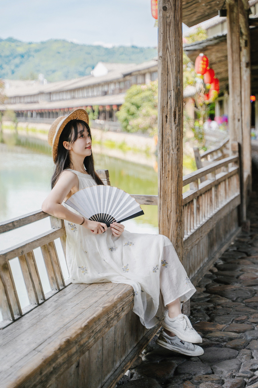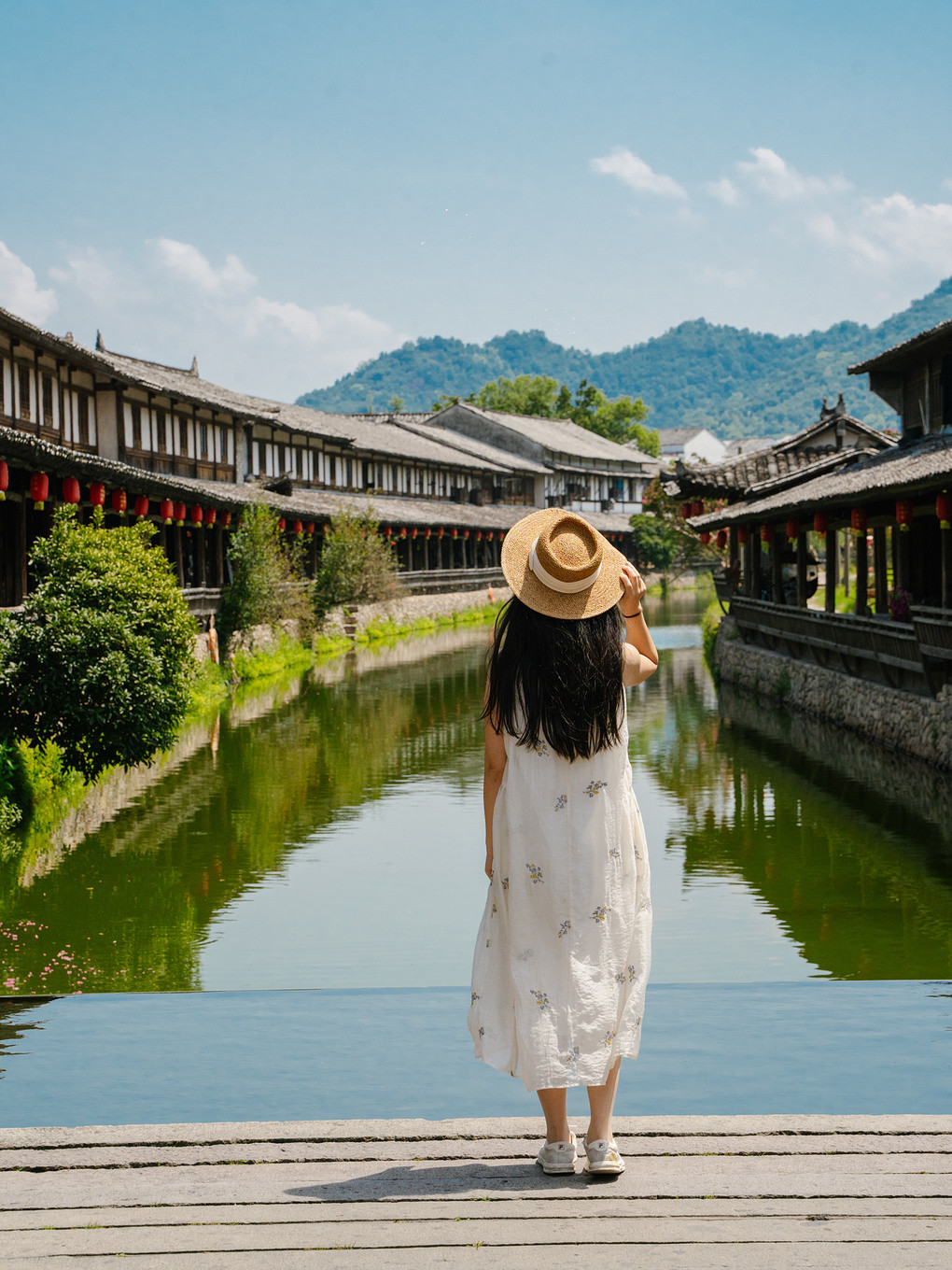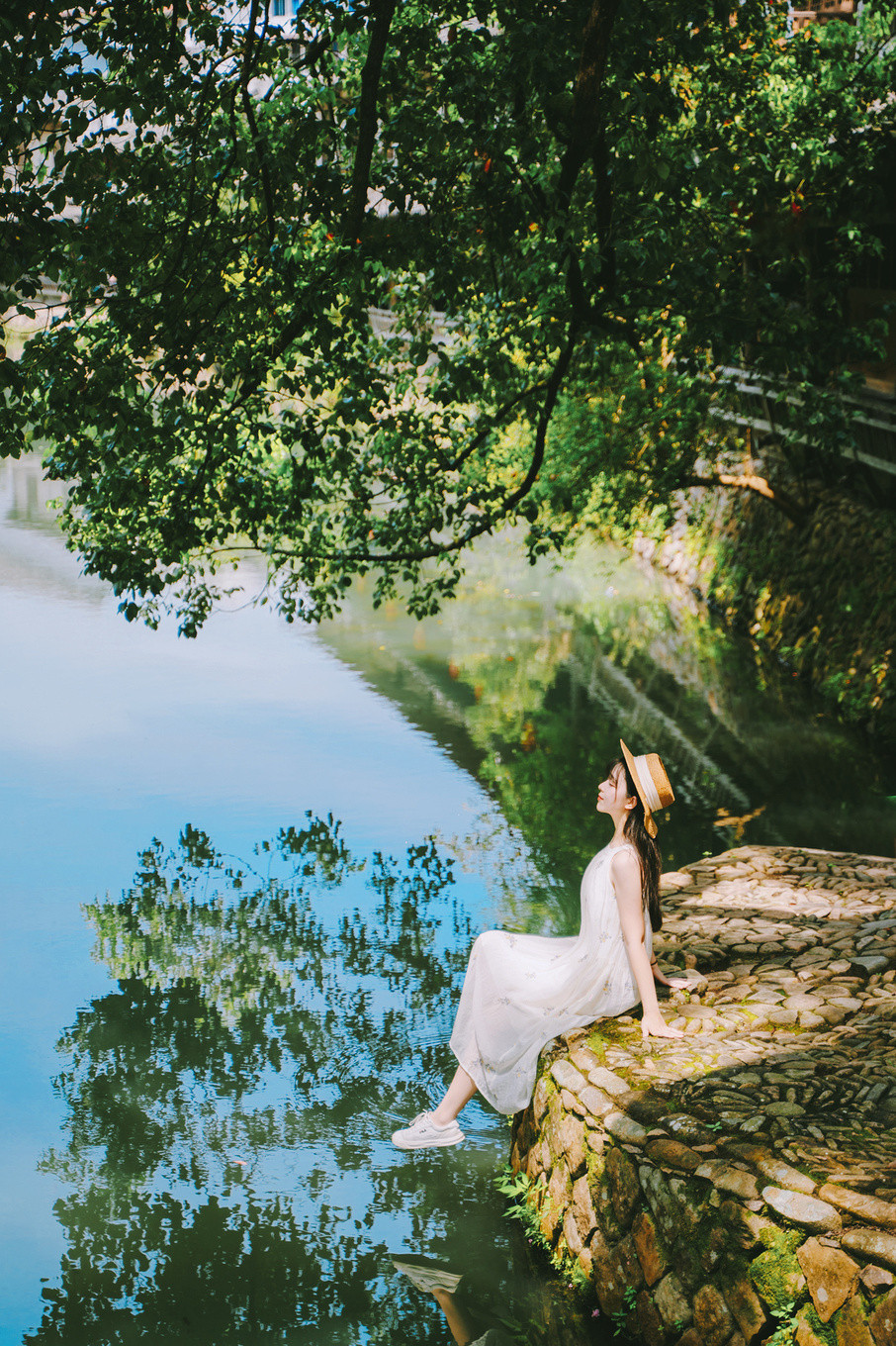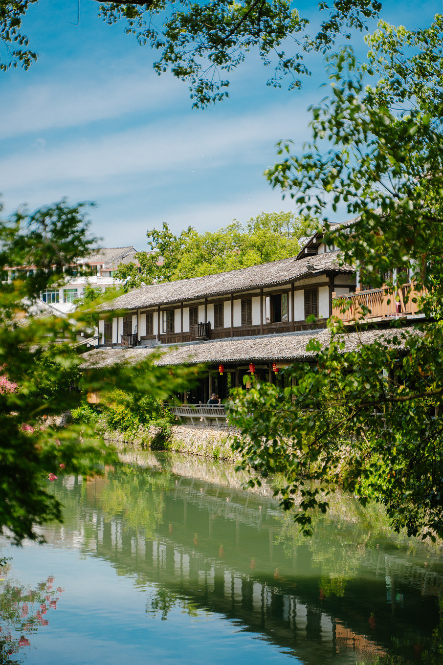 傍晚时分,青瓦木檐,流水潺潺,树下石板幽幽,绿树成荫,微风阵阵拂面而过带走体内积蓄的疲惫,静下心来感受,瞬间就懂了采菊东篱下,悠然见南山的闲适~