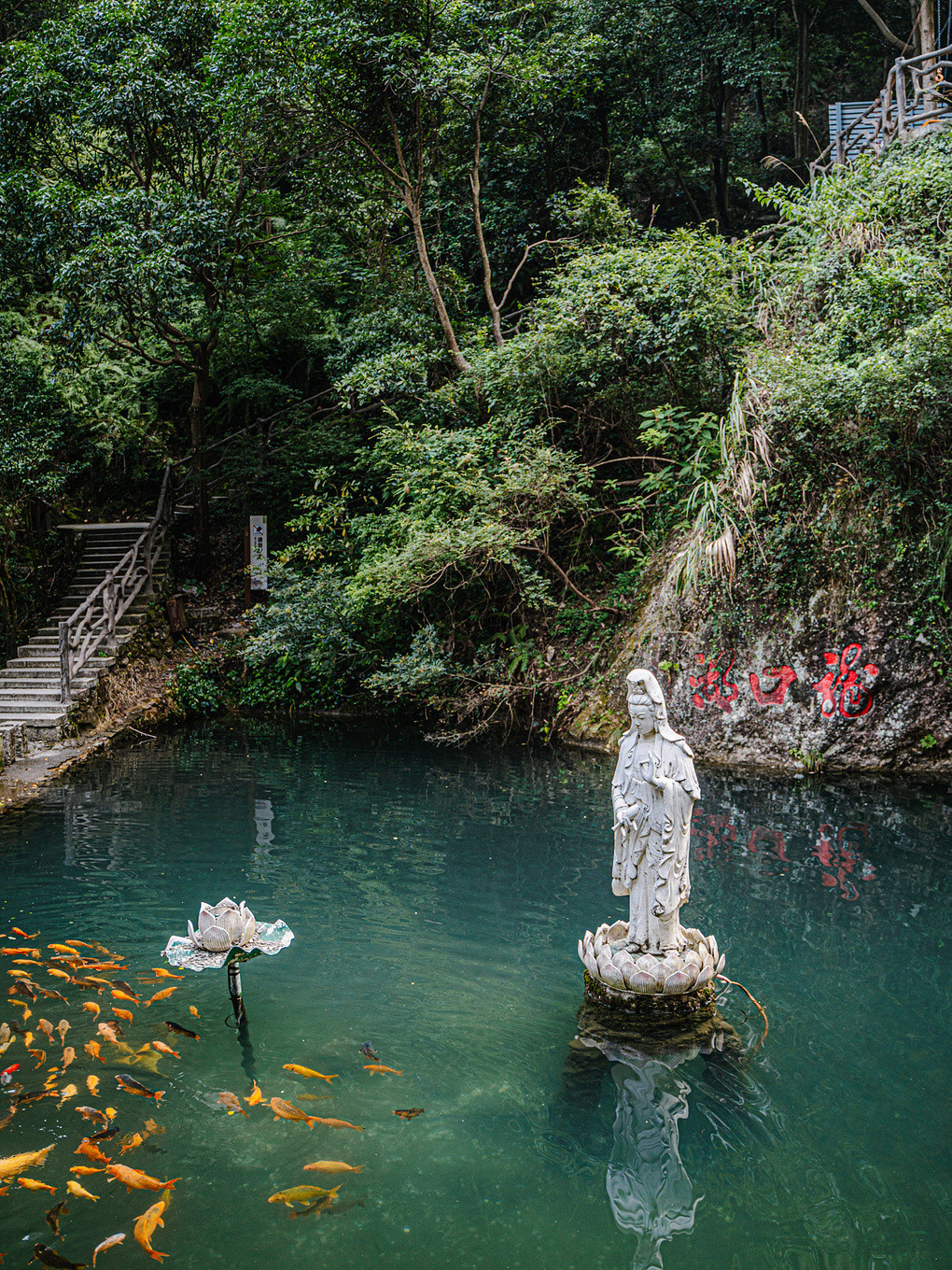 陶公洞外清凉的岩壁环抱中,有一条大大的放生河,池水映着洞口的天光,水质清澈见底,池里都是密密麻麻放生的鲤鱼,红白锦鲤悠然游弋,在澄澈碧水中自在穿梭,为古朴的石洞增添一抹鲜活的生机!
