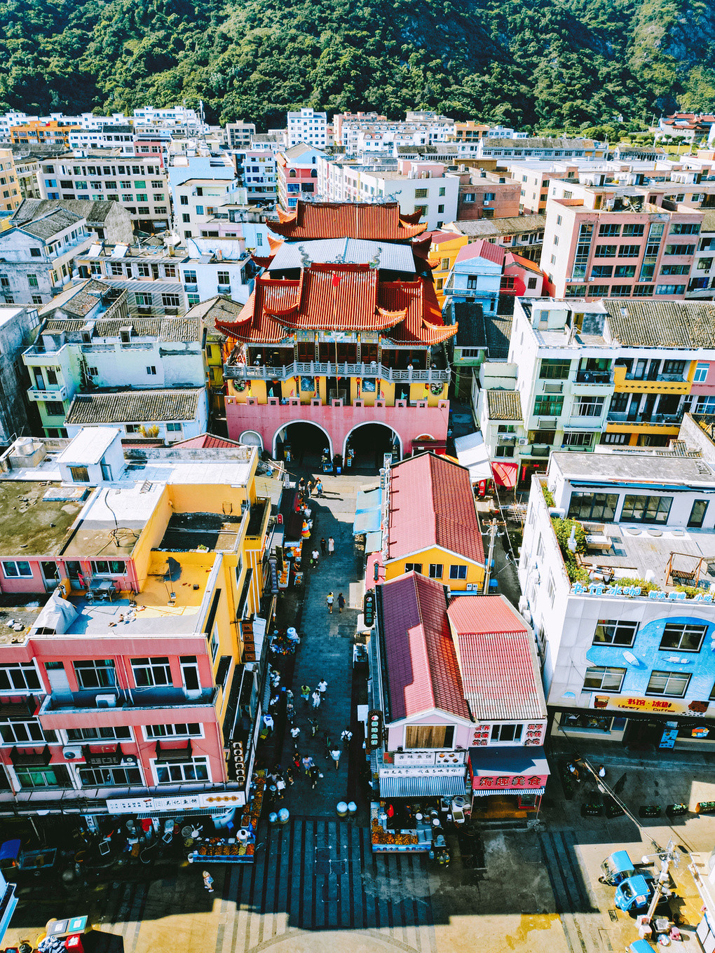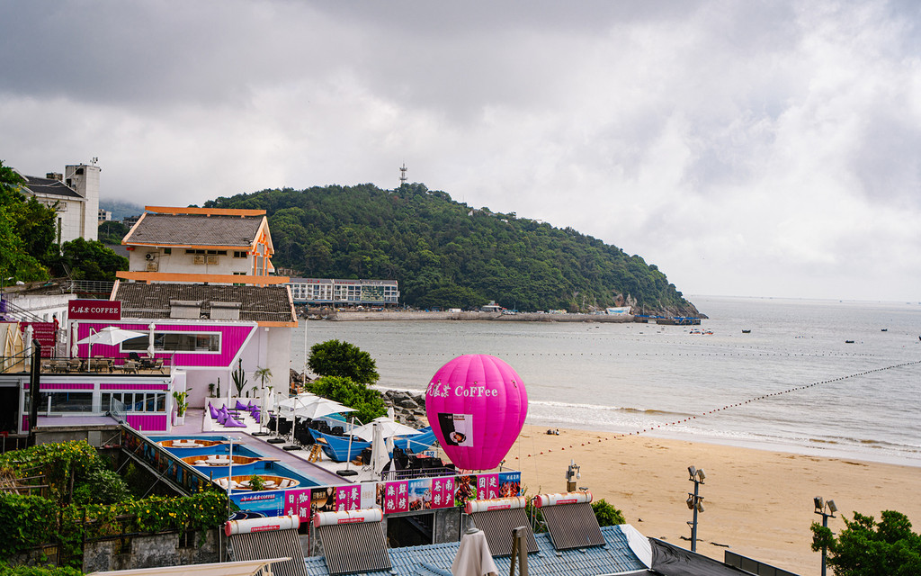 不远处的沙滩和彩色的房子非常漂亮。中间一排的茅草伞,坐在下面仿佛来到了菲律宾度假,非常休闲。