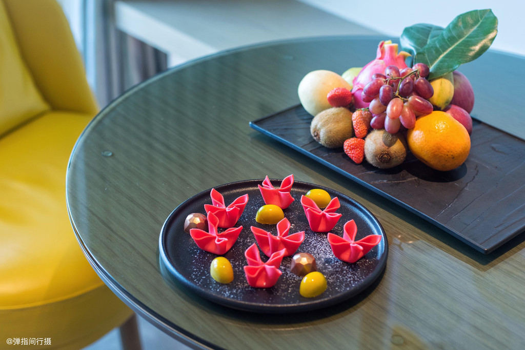 酒店设有270间客房及套房,面积宽敞,最小的客房面积也有42平米,套房更有168平米的超大空间,设计风格也以简约线条和清晰分区为主。客房内部的装饰风格与酒店整体设计格调一脉相承,以简约素雅的亮色和原木色为主调,营造宁静和原生态的氛围。色彩鲜艳的欢迎果盘和甜品拼盘,则带来浓浓的热带海滨度假感。