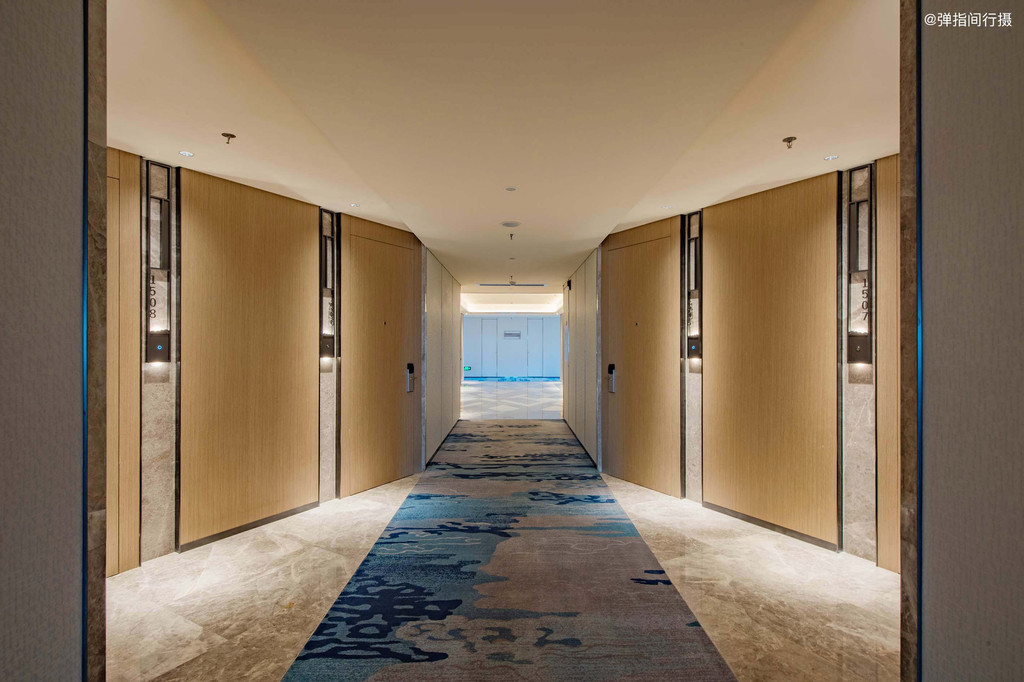 客房楼层走廊简洁通透,看似简约,实则蕴含巧思设计。一条充满海洋风的蓝色地毯,引领宾客走向客房,而客房的门被“藏”在对称的几何图形之中,形成有机整体,视觉效果简约而清新。