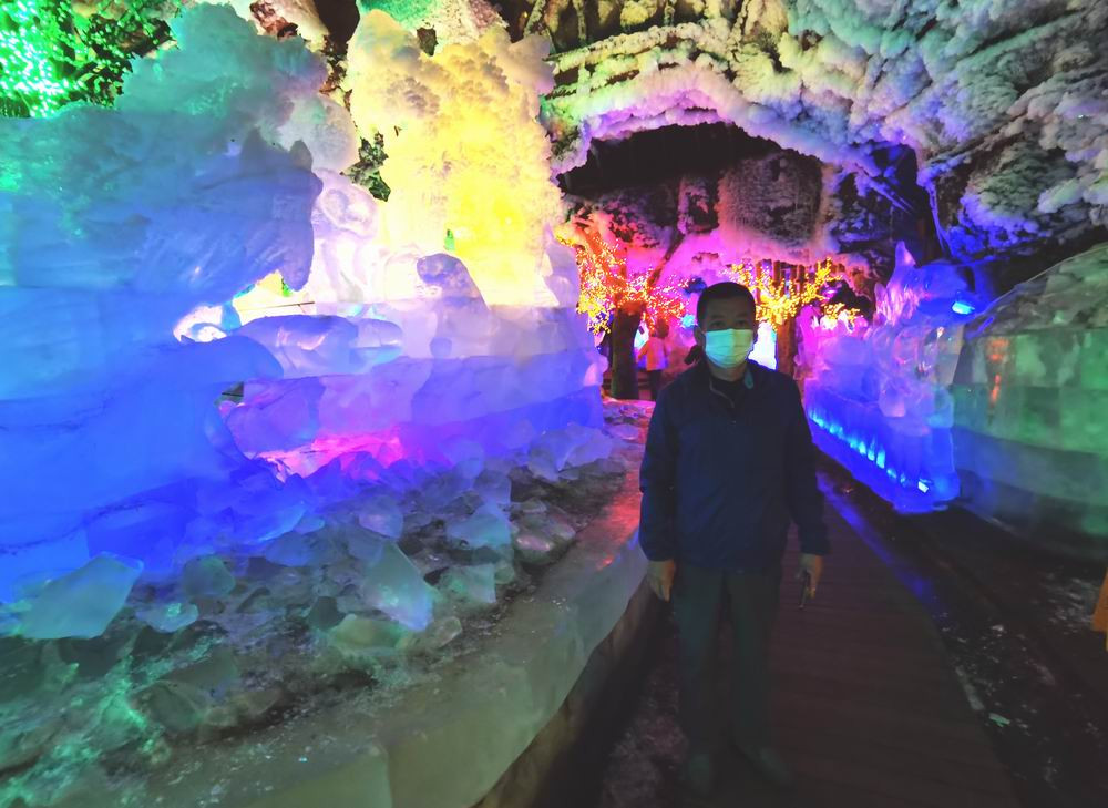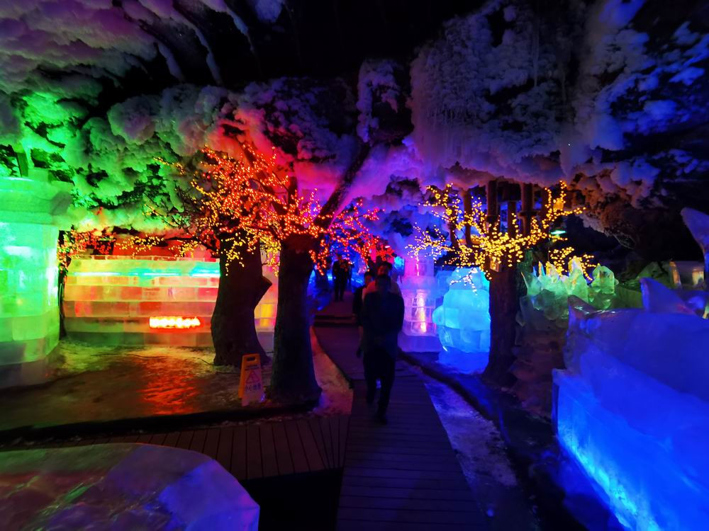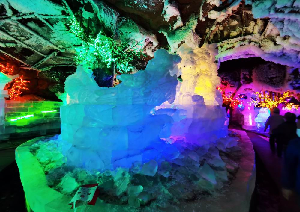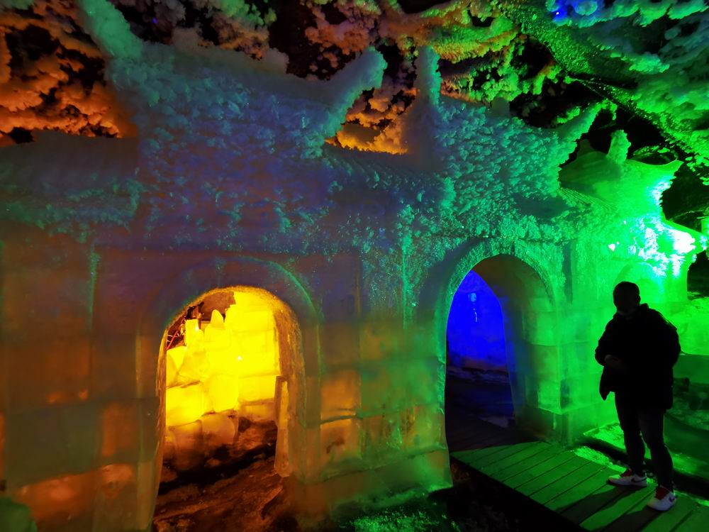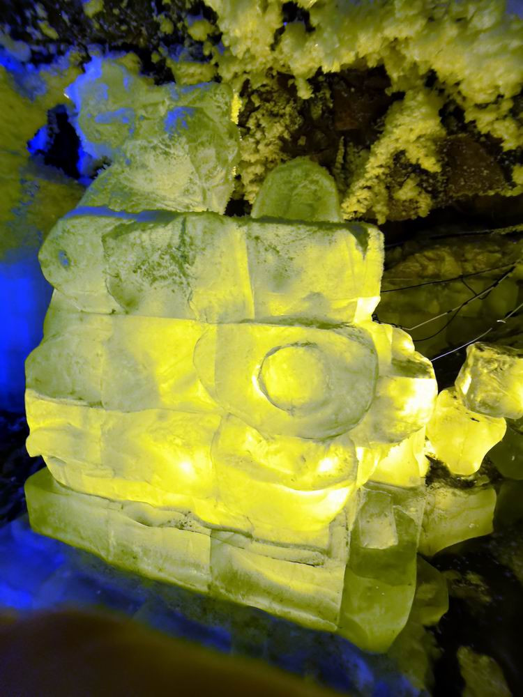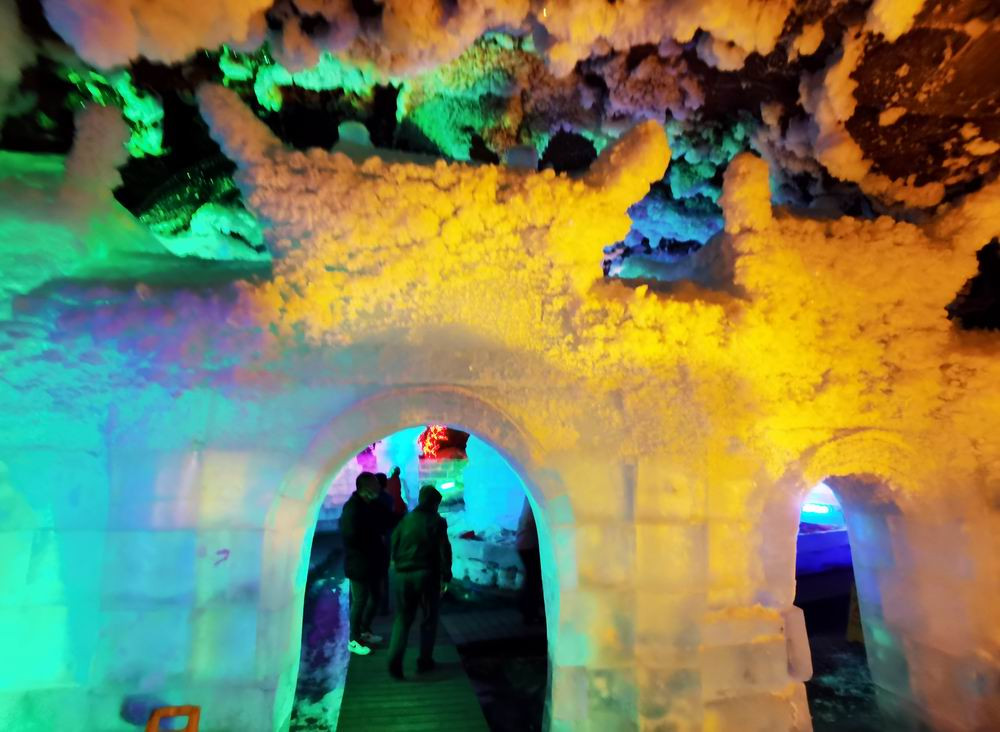 走到隧洞尽头,这是一座彩灯映耀的巨大洞穴。这里的冰雕分为好几层,最上面是一尊如来佛像。