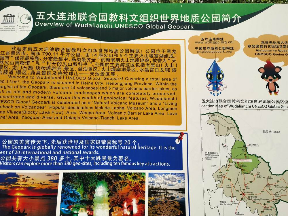 我们此行的第一站是五大连池风景区。五大连池风景区,位于黑龙江省黑河市五大连池市,距五大连池市区18公里,地处小兴安岭山地向松嫩平原的过渡地带。现为国家AAAAA级旅游景区、世界地质公园、世界人与生物圈保护区、国际绿色名录、国家重点风景名胜区、国家级自然保护区、国家森林公园、国家自然遗产、中国矿泉水之乡、中国著名火山之乡、圣水节(药泉会)国家非物质文化遗产。图为五大连池景区的简介。