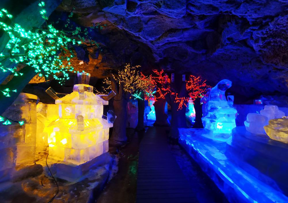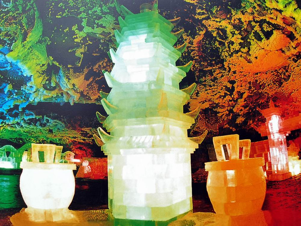 如玉的霜花遍布洞顶,晶莹剔透,给粗犷的地下溶洞增添了几分纤柔、细腻之美,洞底寒冰终年不化,“盛夏霜花现,酷暑冰雕艳”的彩色洞府使您如入仙境。