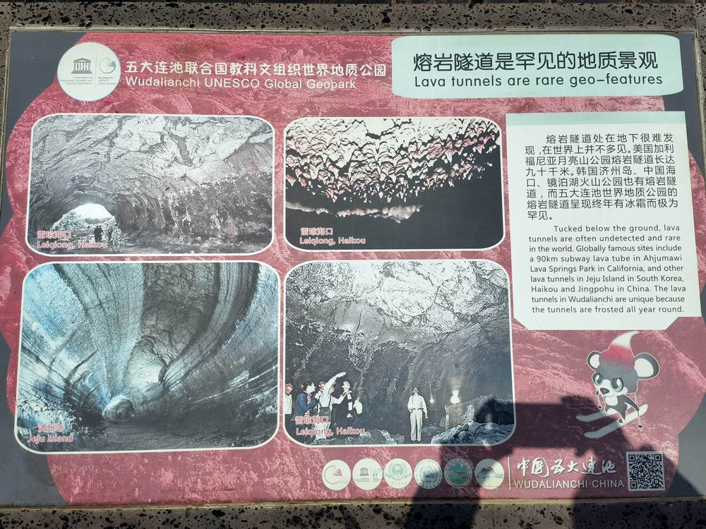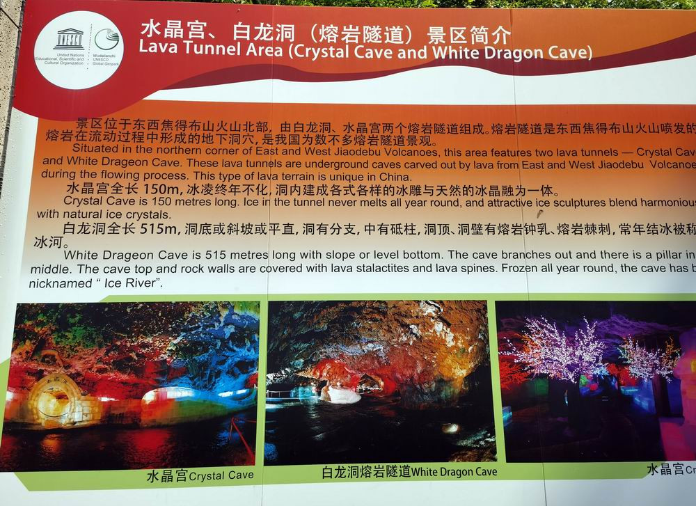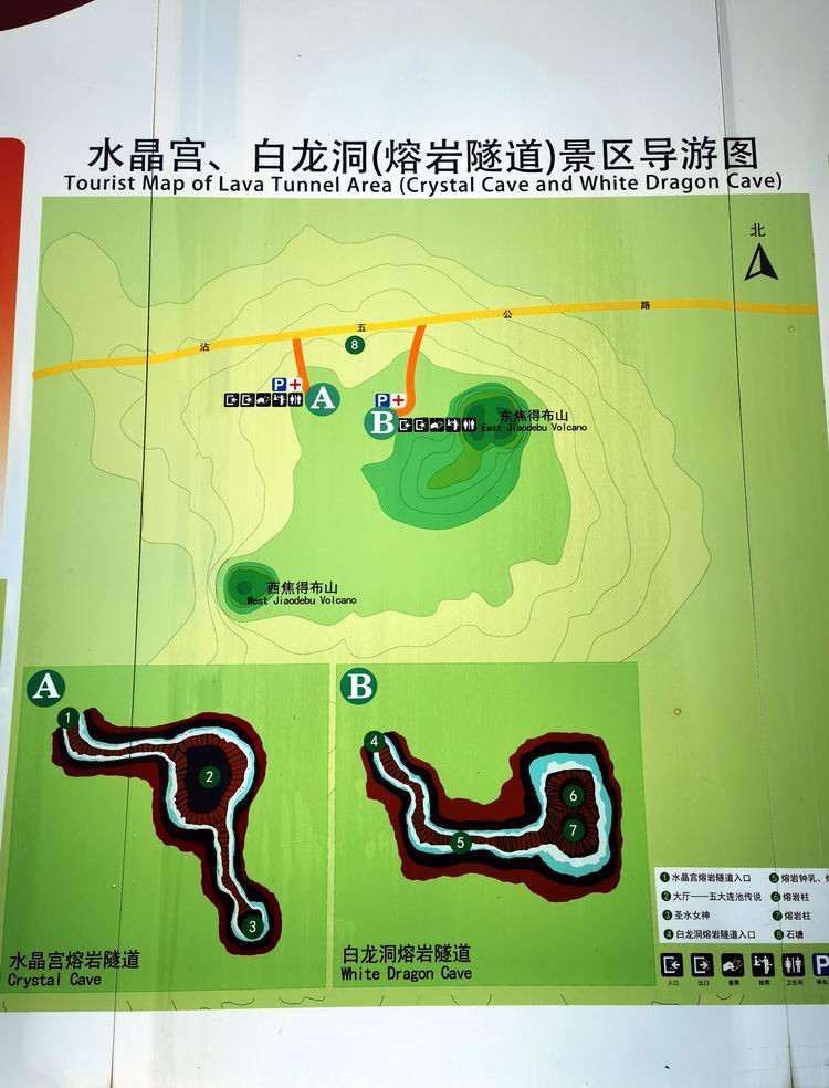 到五大连池主要看的是火山奇观。然而,在没见到火山之前,我们首先看到的却是火山喷发造就的地下熔岩冰洞。图为五大连池熔岩隧道景区的导游图。