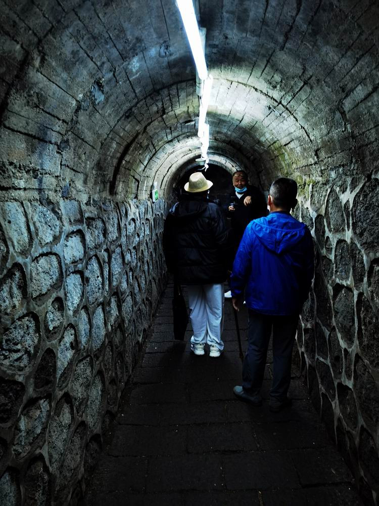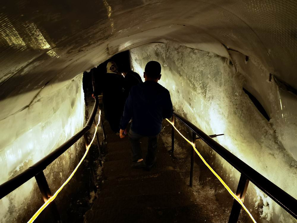走下隧洞里的地下的石阶,越往下,气温越低,隧洞两边都是冰了。