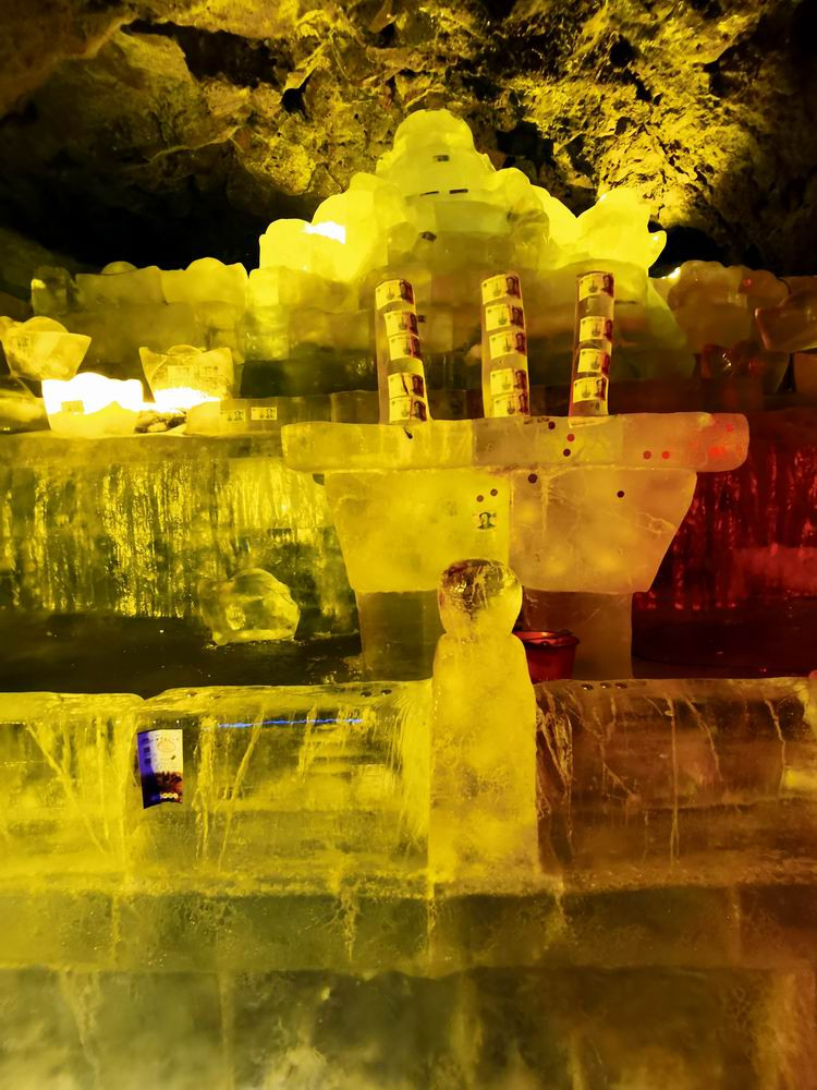洞内是一个冰封霜染的银色世界。无需任何制冷设备,溶洞本身就是一个绝好的冰雕保存场所。