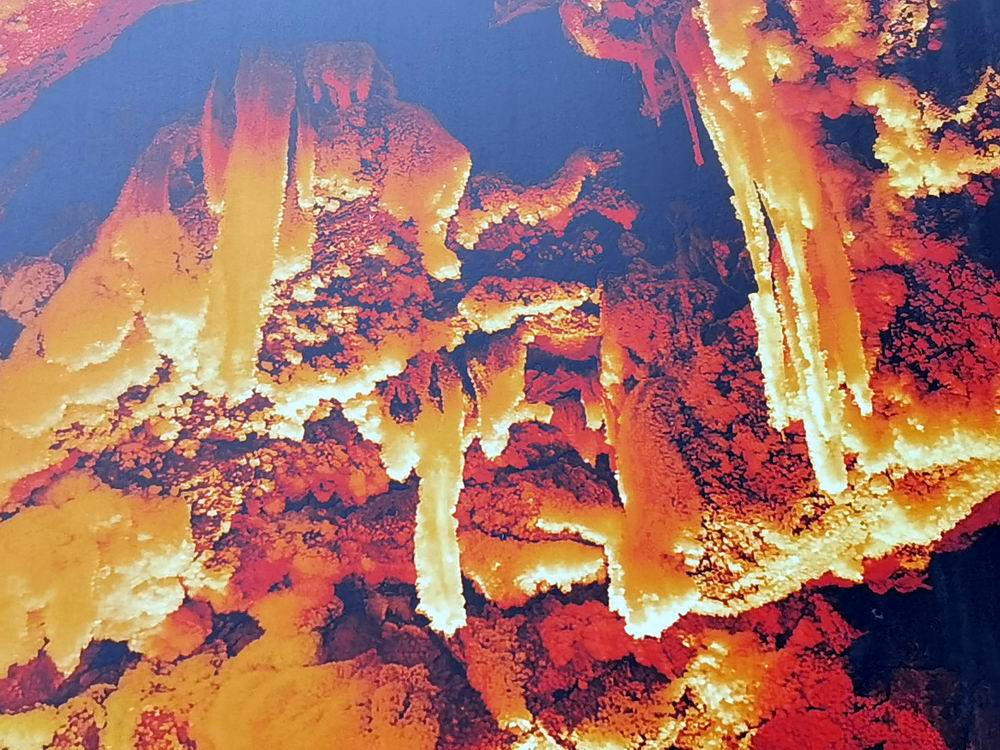 洞穴被红色的、绿色的、蓝色的、黄色的射灯照映,显出一种魔幻般的色彩,有些洞壁的色彩和图案简直不可思议。