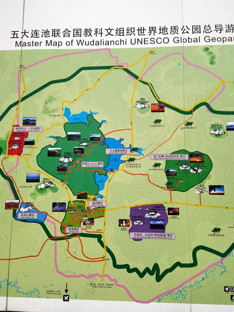五大连池风景区总面积为1060平方公里。1719年-1721年间,火山喷发,熔岩阻塞白河河道,形成五个相互连接的湖泊,因而得名五大连池。图为五大连池景区的总导游图。