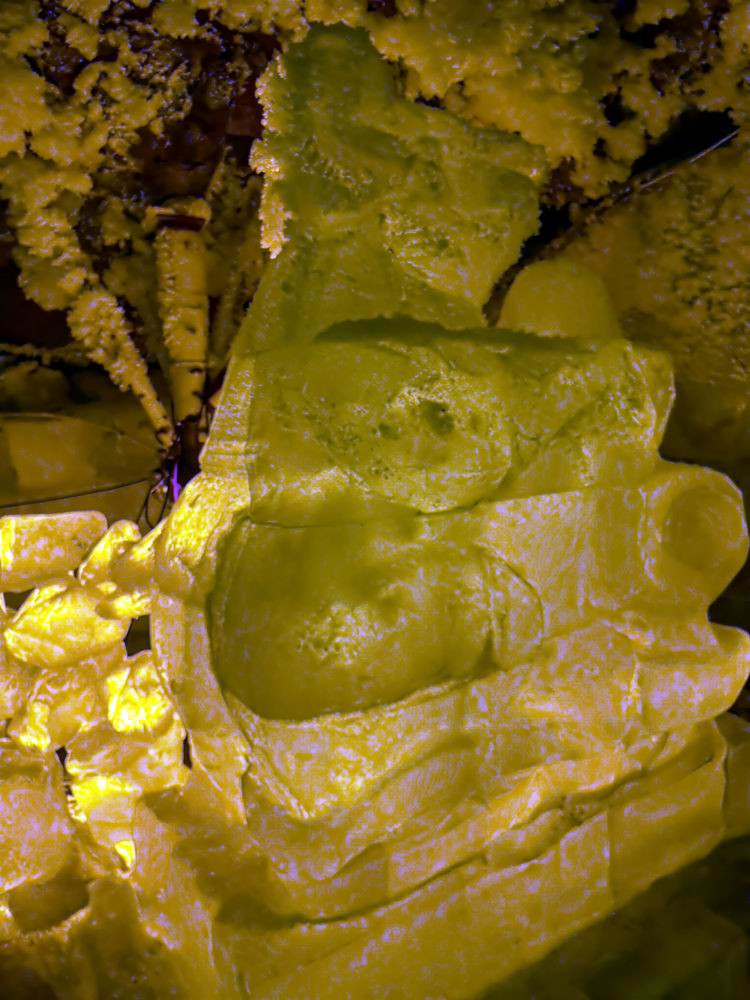水晶宫洞壁是各种奇形怪状的熔岩流痕,洞顶是低垂下来滴淌状的熔岩钟乳。