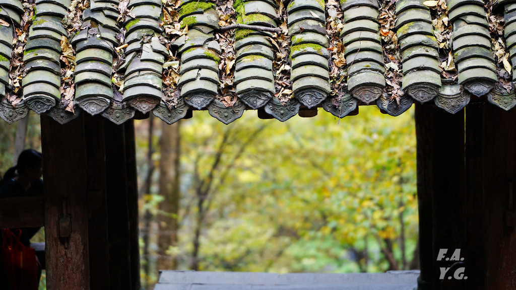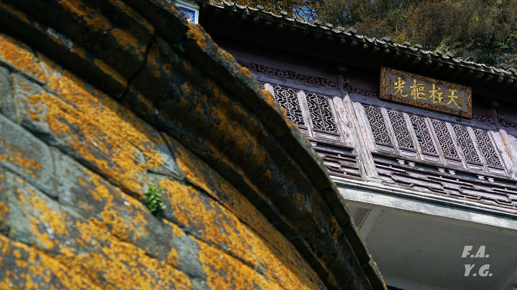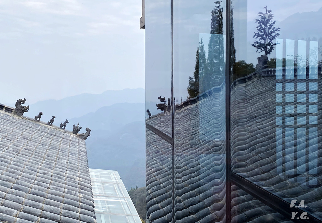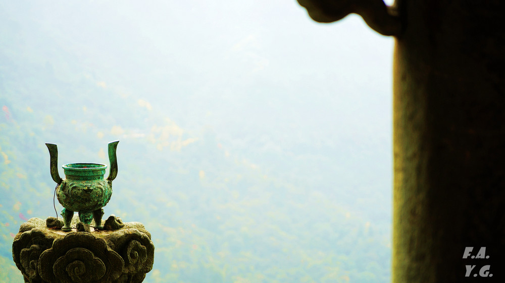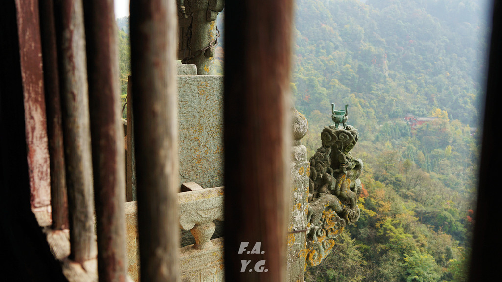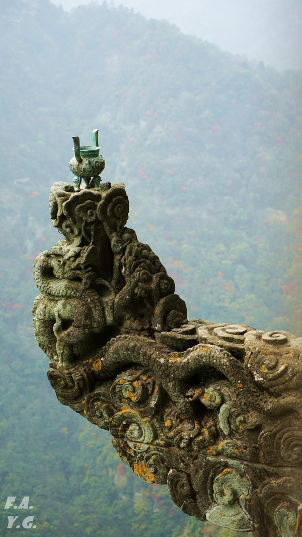 像龟背一样的是金顶所在的天柱峰,左侧翘起的山峰看似龟的脑袋,而环绕天柱峰的紫金城恰如一条蛇。我相信,这样的龟蛇相绕绝不是无意为之。