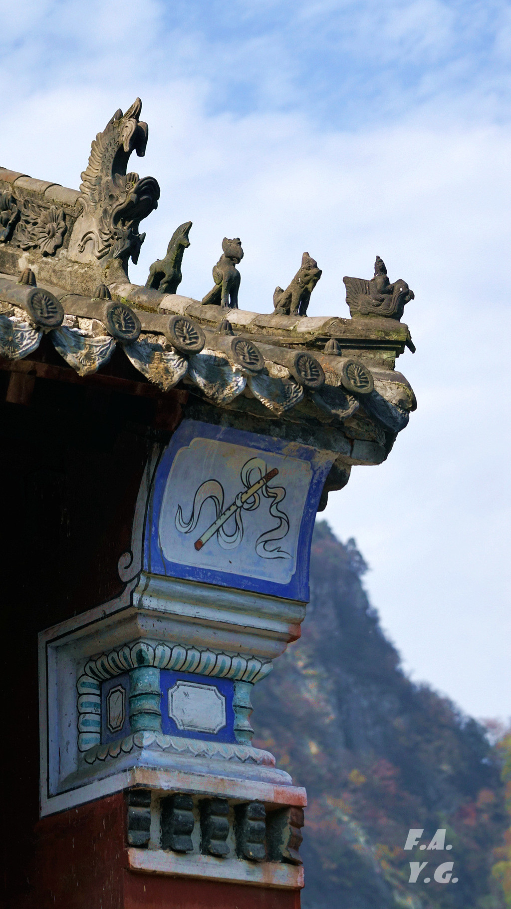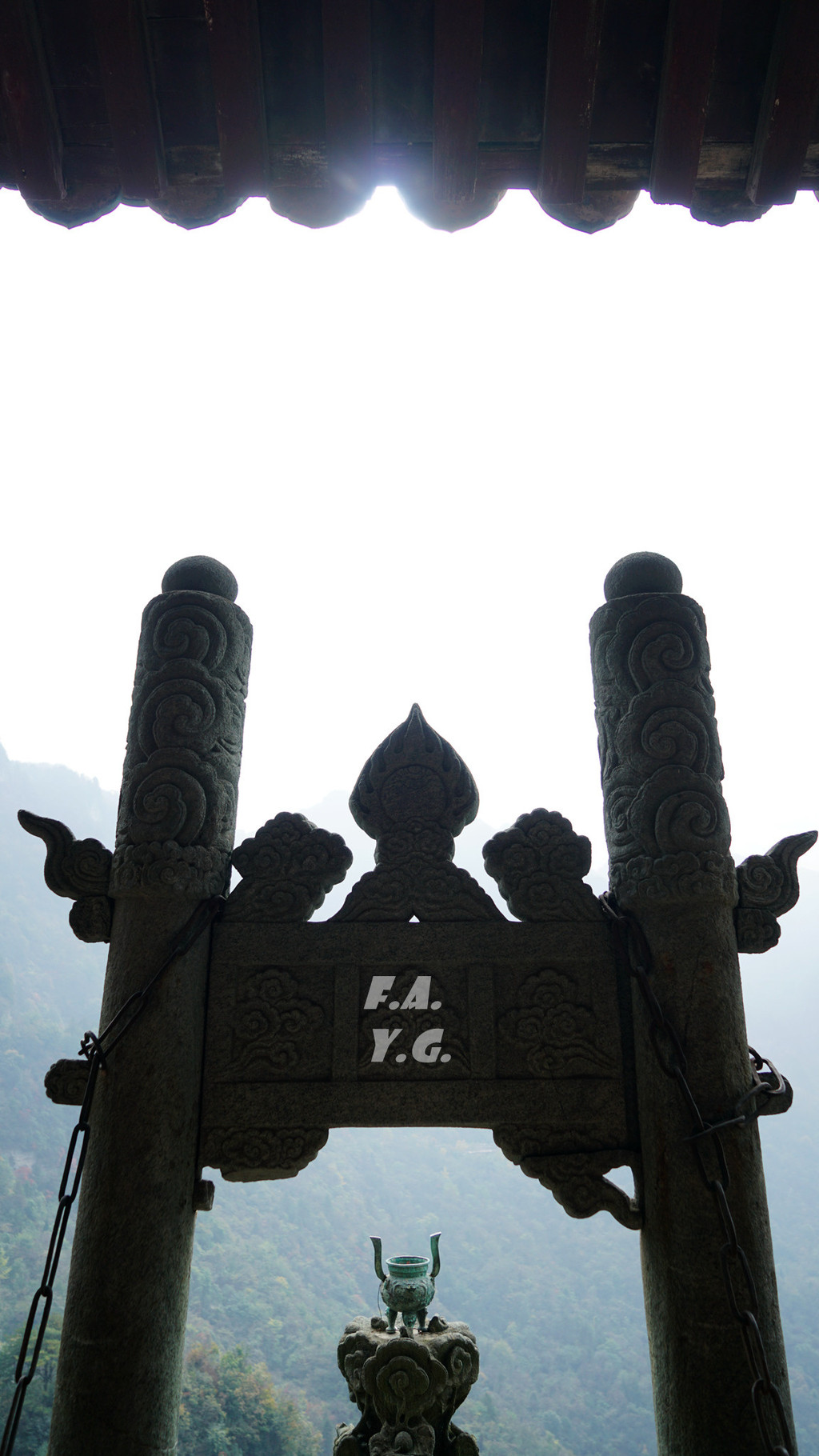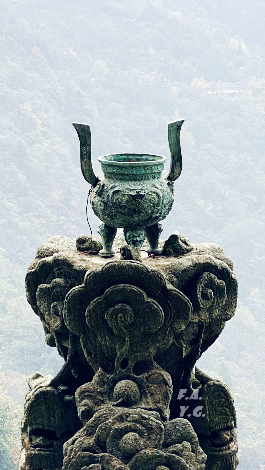 像龟背一样的是金顶所在的天柱峰,左侧翘起的山峰看似龟的脑袋,而环绕天柱峰的紫金城恰如一条蛇。我相信,这样的龟蛇相绕绝不是无意为之。
