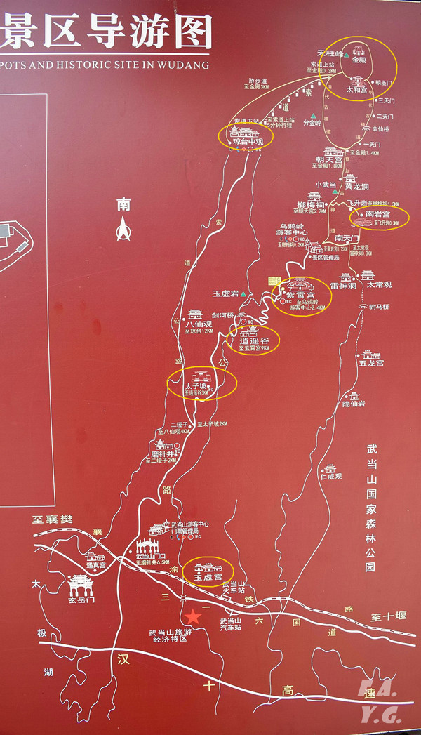 武当山景区内几个重要点:太子坡、逍遥谷、紫霄宫、南岩宫、琼台中观和太和宫、金殿,还有山脚下武当山市区里的玉虚宫。