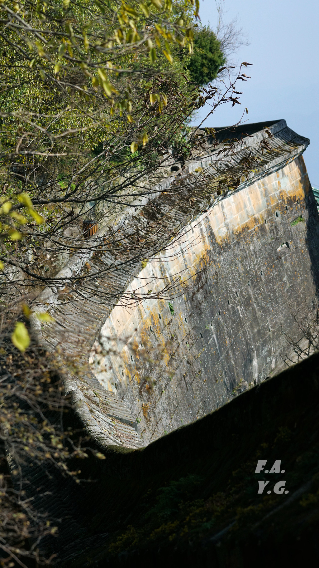 最终历时五年完工、用重达千斤的巨型石条砌筑的城墙周长344米,居险临危却又坚固稳重,远看犹如一道光环围绕金顶,蜿蜒起伏。
