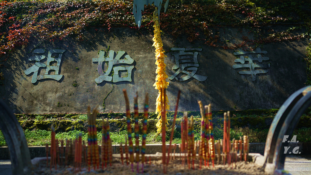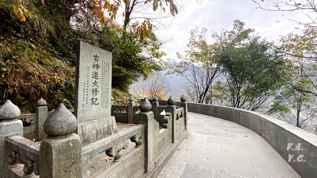 古神道大修记:乌鸦岭至金顶古神道始建于明清,历经数百年破损严重,公元2003年始,全面大修。修缮总长4800米,安装踏步6560级,搁板820套,铺地墁石5770平方米,人工搬运物资10000余吨,总投资1000万元,历时900天竣工。