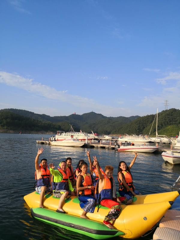 这时,看到码头有一个香蕉一样的充气艇飞一样驶来,一阵水花溅起,引来上面3、4名游客阵阵尖叫,女儿瞬间被吸引了,提议要玩,我们询问了工作人员,确认安全性没问题(穿救生衣很安全的)后就登上了该船,我们玩得很嗨,虽然衣裤都打湿了,但很刺激好玩。