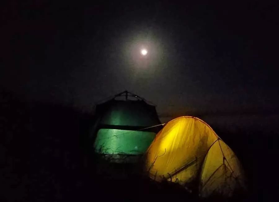 那时,天已经全黑了,一行三人,打着手电筒,翻出景区的栈道,在寒风中缓缓前行,半个小时后,终于找到了一块相对平坦的地面,激动地在月光下将兩顶帐篷撑开。