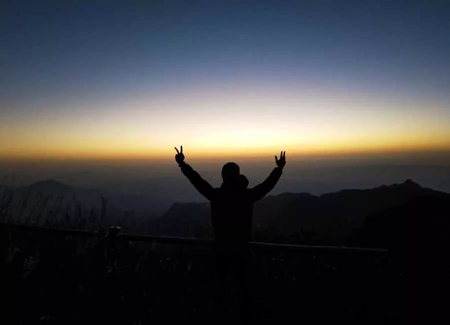 第二天早早起床看日出,一对男女路过,女的惊讶十分,才发现日出了,拿着手机对着日出方向,在吊马桩的半山腰,一顿狂喊:“呀呀呀,我在金顶看到日出了。”惊悚得很。