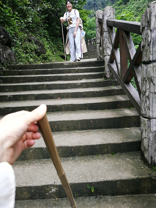 上午感觉没有损耗体力,所以选择不坐缆车全程爬上去。在山脚下买了拐杖(1元)跟雨衣(10元,开价30)找了家可以停车的餐馆吃饭,吃完大概2点左右就开始爬山,选择的步行道,大门往右边楼梯上去。开始的天气有多风和日丽,心情有多美好。