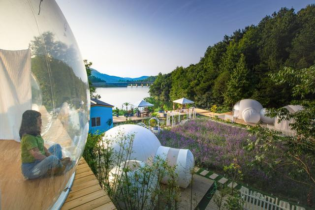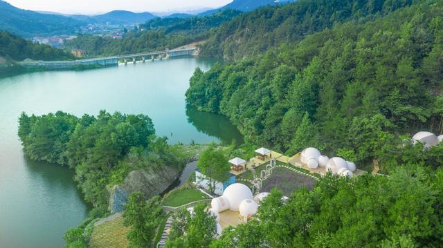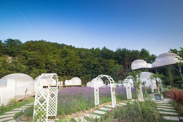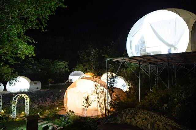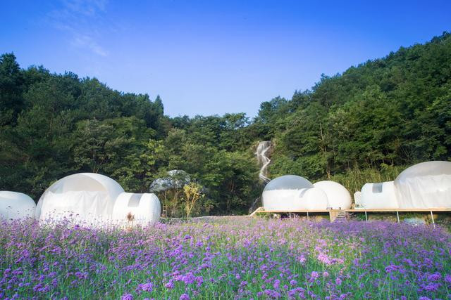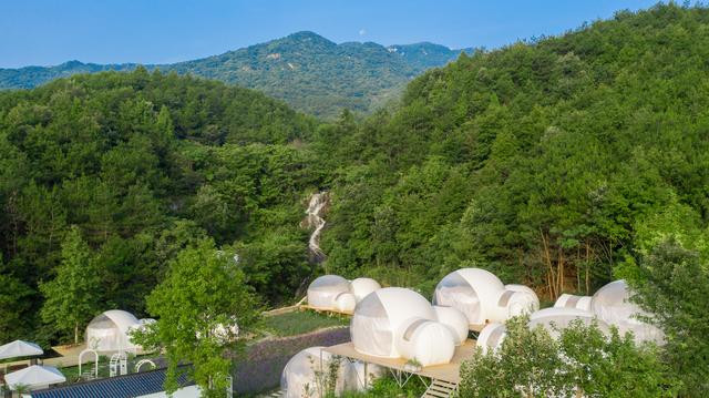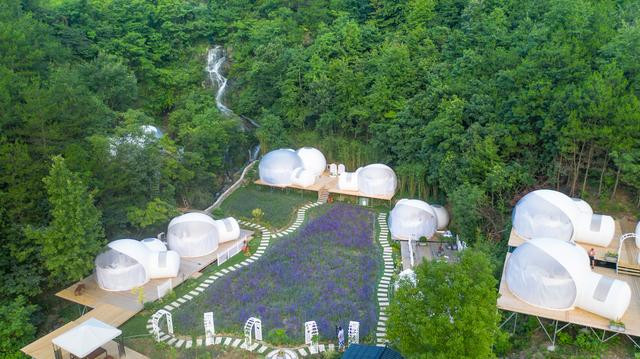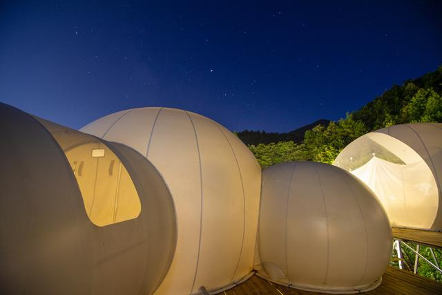星空泡泡屋就坐落在距离武汉市区仅1.5小时车程的锦里沟景区。十一间泡泡屋宛如一颗颗珍珠,镶嵌在锦里沟的青山绿水间。蓝天、白云、湖泊、瀑布、森林,再加上白色泡泡屋,一切都美得刚刚好。清风徐来,刹那间,恍若闯进了宫崎骏动漫里的夏天。