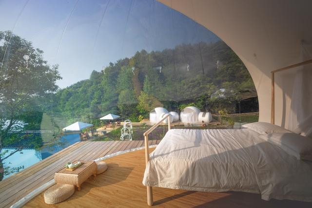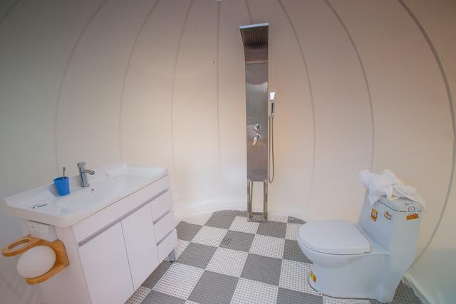 每间泡泡屋由两个泡泡组成,大泡泡是卧室,小泡泡是独立卫生间。按捺不住激动的心情向房间走去。泡泡屋内部空间足够宽敞,整体风格简约,给人呈现出一种纯粹的视觉美感。白色窗帘和木色地板泛着淡淡的柔光,啊,我简直太爱这里了!