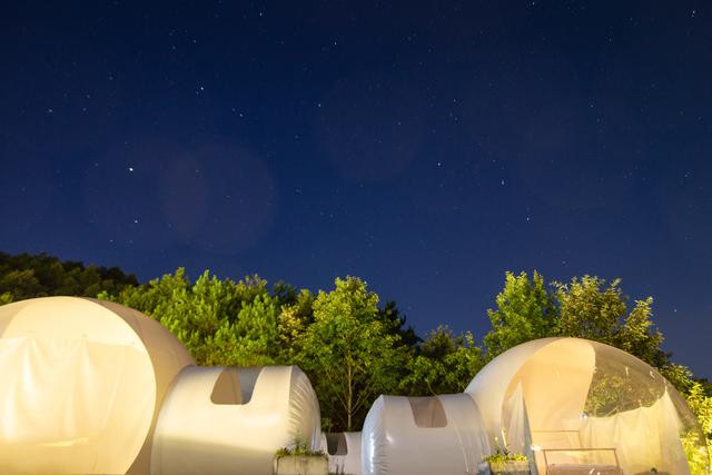 抬头发现泡泡屋的屋顶有一部分是透明的,透过透明屋顶望着蔚蓝的天空,我已经迫不及待期待夜晚的到来了。