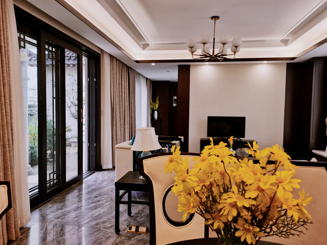 客房内的设施也是很完善的,房间的风格也是中式,呼应了民宿的整体风格。房间内的落地窗是一个推拉门,通过推拉门就可以进入民宿的私人花园。