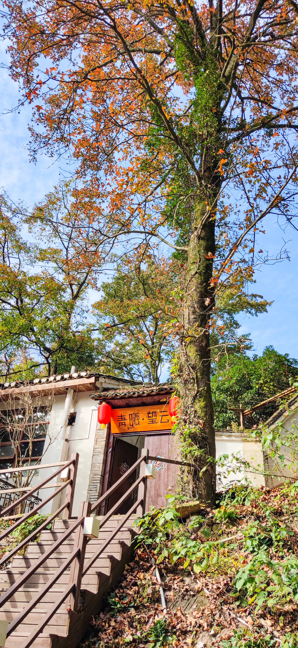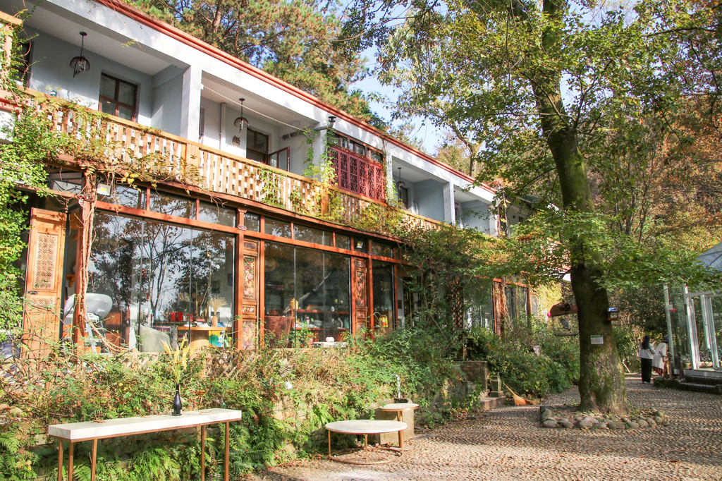 对青曦·望云的第一印象是幽静。与闹市里的静不同,青曦·望云的静更显空旷、清远。最先引起我注意的是民宿门口的树木,那几棵树算不上多么粗壮,却异常挺拔。秋风爬上树梢,在山中割出细碎的声响。树上的叶子已经变黄了,却丝毫没有萧瑟之感。树干上长满了青苔也爬满了藤蔓,深深浅浅的绿与树叶的橘黄搭配在一起甚是好看呢。树下略显窄小的民宿大门看起来似乎并不起眼,走进去才晓得里面另有一番天地。