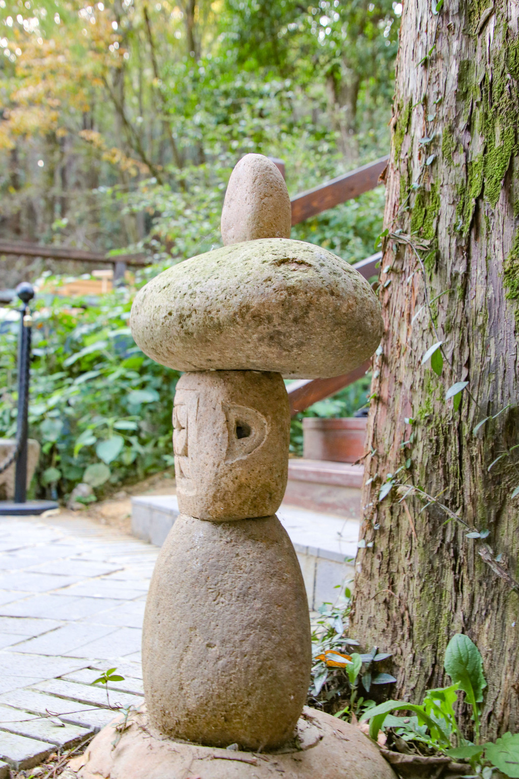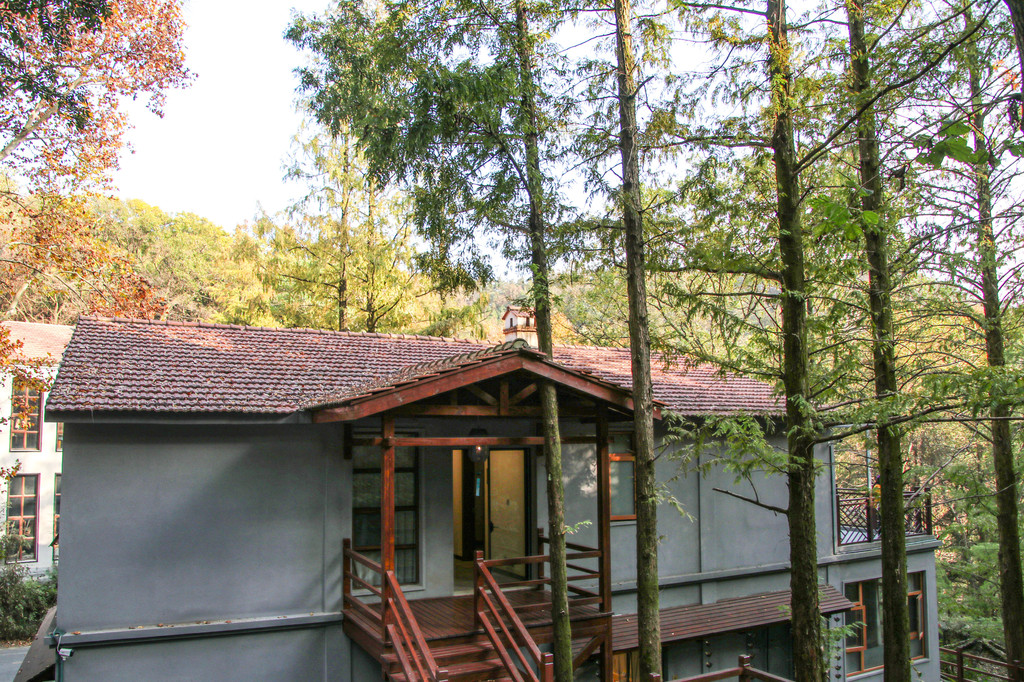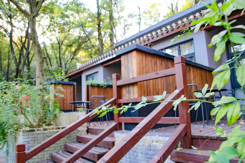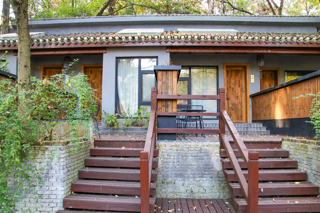 樾和·林泉依山而建,所以台阶非常多,不管是木质的还是青石板的,踩上去都非常有感觉。民宿前后共两栋小楼,后一栋是由木兰山哨所改建而成的。中式的建筑和家具,日系的地灯和风铃,中日混搭的风格成了樾和·林泉区别于武汉其他民宿的特点。