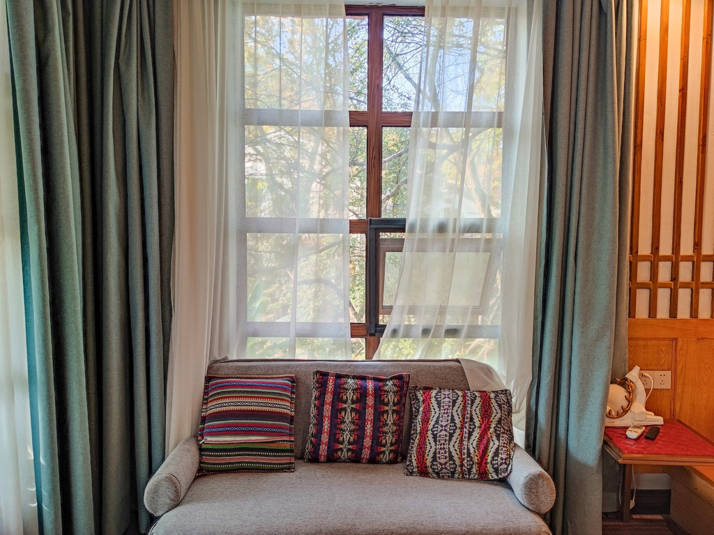 一方院落,两层小楼,目之所及皆是青翠养眼的绿,房前屋后种满了叫得出名字的以及叫不出名字的绿植。院落正中央是一棵高大古老的树,至于这棵树有着怎样的故事,恐怕还要请民宿主人去为你讲述。橘色的木门渲染了一地的暖意,透明落地窗折射出一院子的清幽,我在“豪华软座”的秋千上荡漾出满心欢喜。不得不说,住在这样的民宿里,真的是太治愈了。