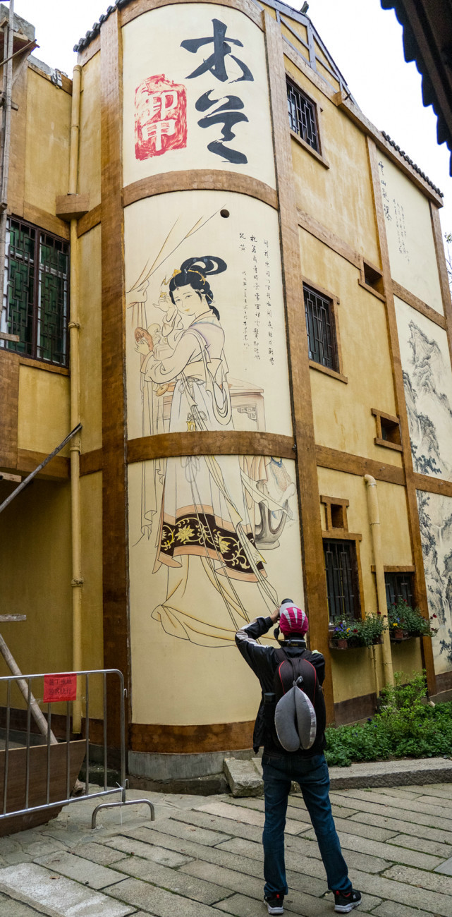 在景区内,花木兰元素很多,这面墙上,画着一幅巨大的花木兰素描画,这只是其中一处。