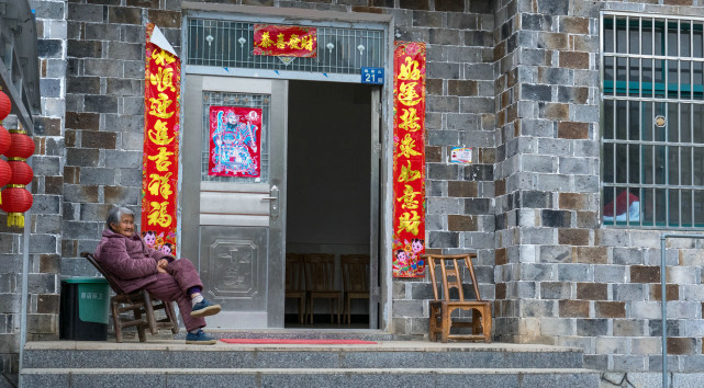 一位村民老奶奶正坐在自家新房前门口,看着来往村子的游客。