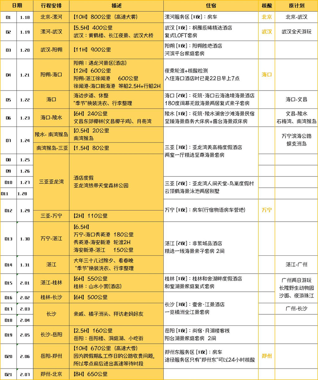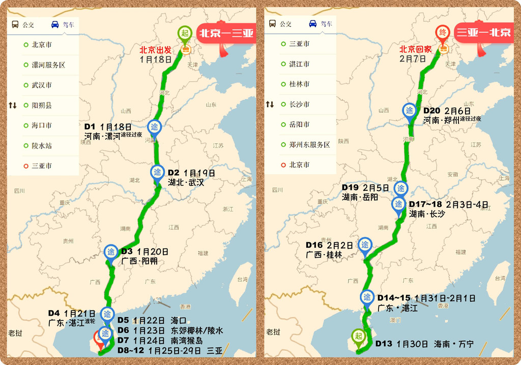 先把我们实际的北京-三亚往返路线汇报一下吧(只是列出了旅游相关的目的地,没有包括途径夜宿的地点。详细的在下方两个图片里有哈)