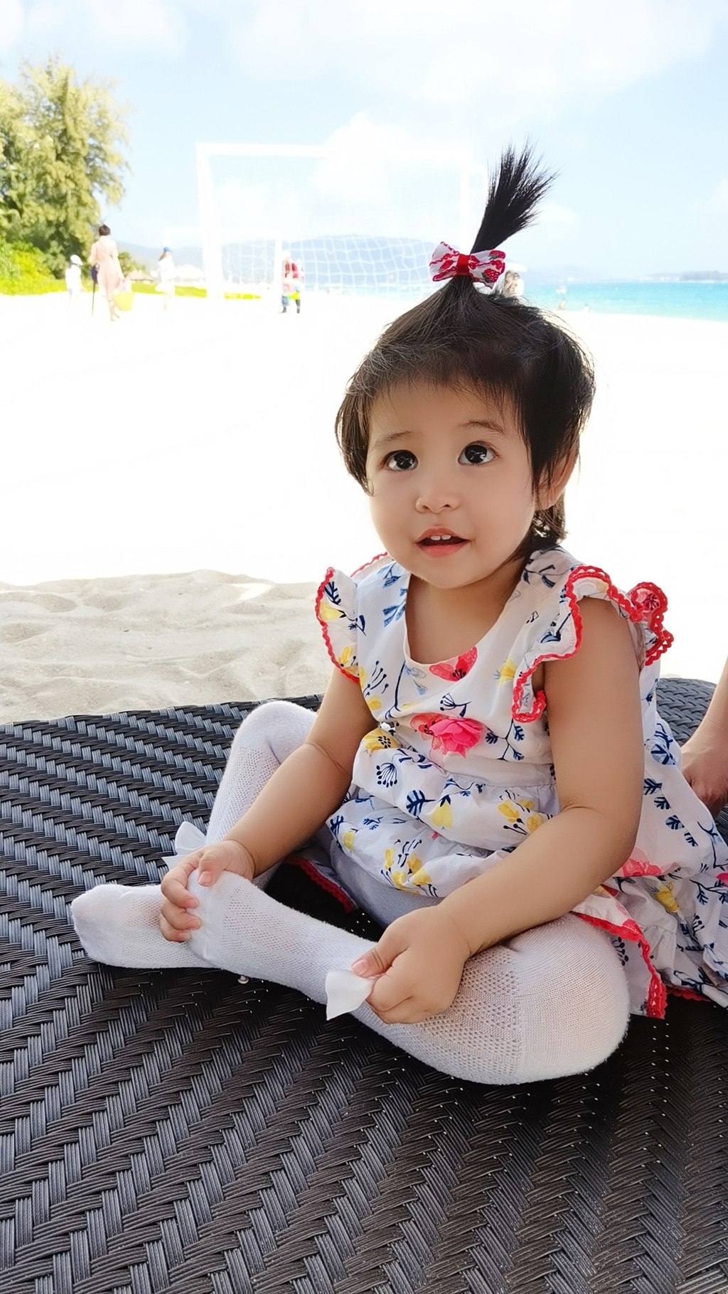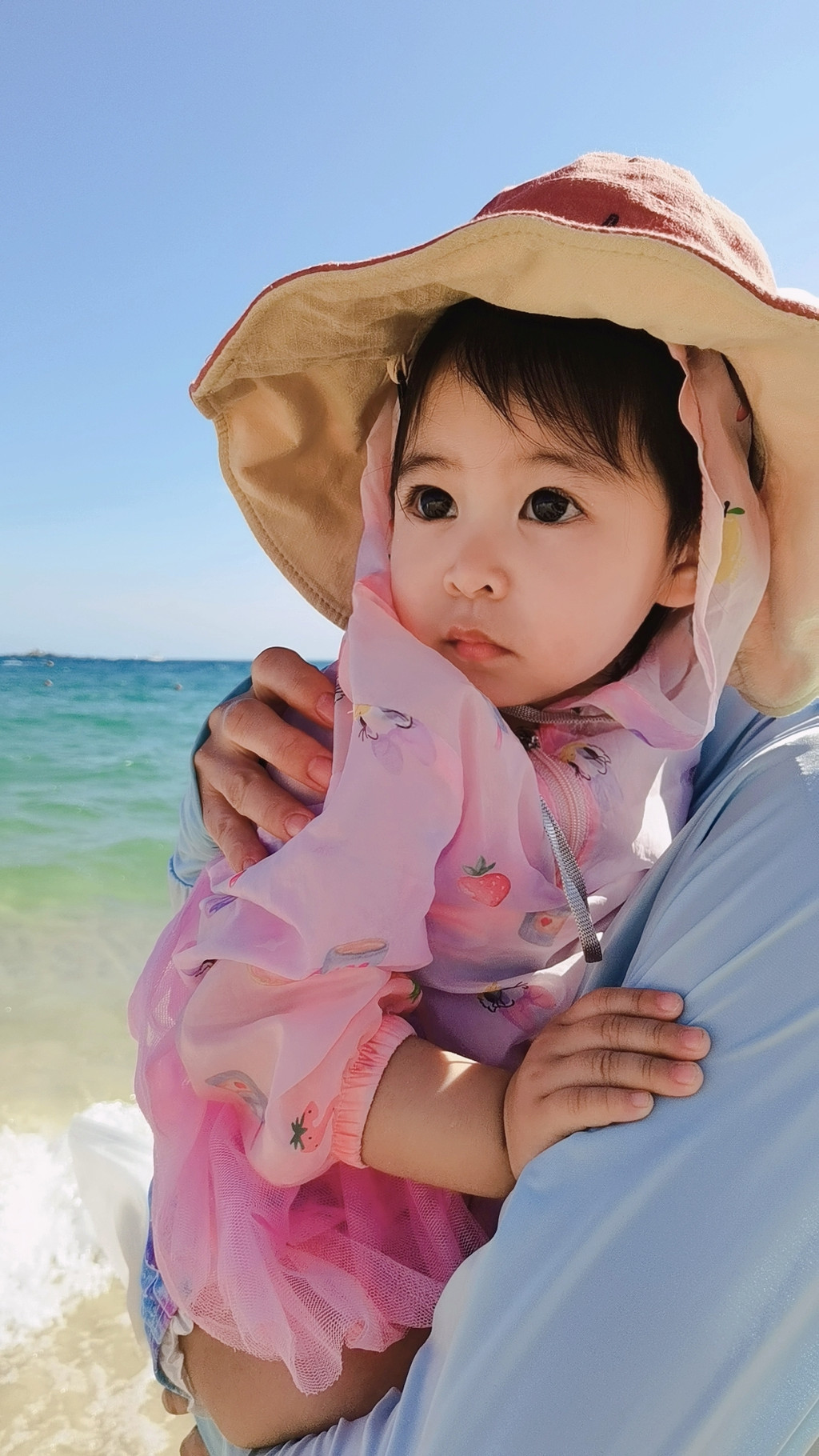 至于三妹妹么,大概是第一次来海边,一直不肯下地,扔在沙滩上就一直嗯啊滴叫,腿软得貌似战斗站不起来了。所以,就只能各种装萌扮甜啦。