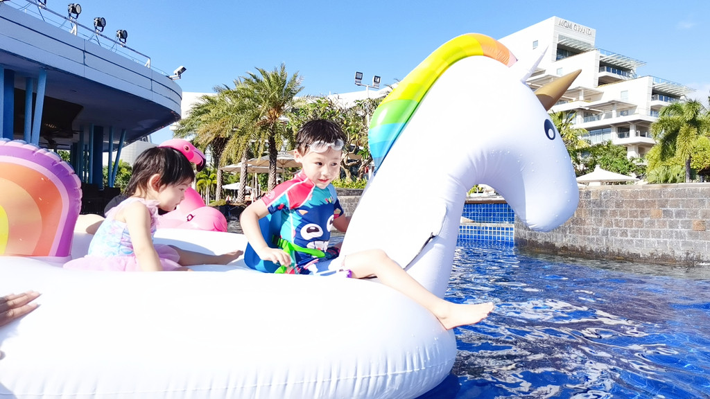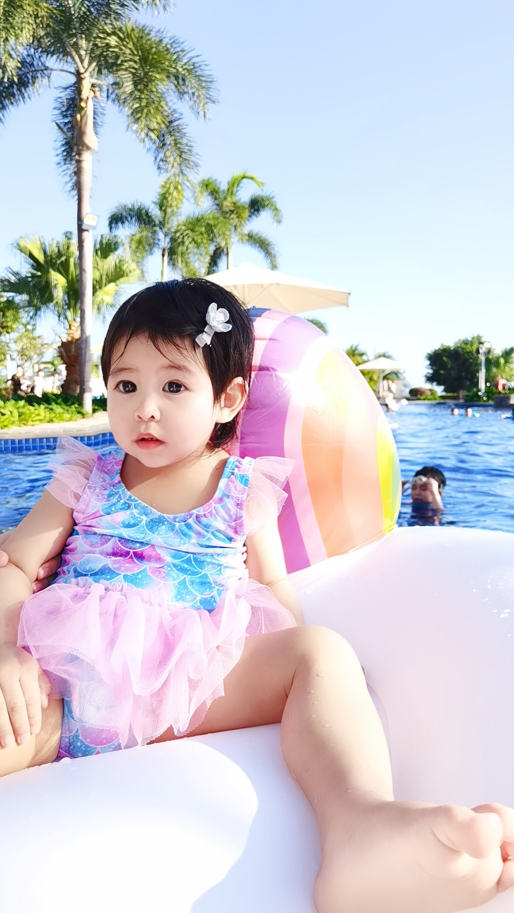 两室一厅,两个卫生间,空间还算是比较大的,孩子们玩起来比较畅快。最主要的是厅和两个房间都通着露台,不仅有私家泳池,还有可以遥观山海。真的是爽死了!