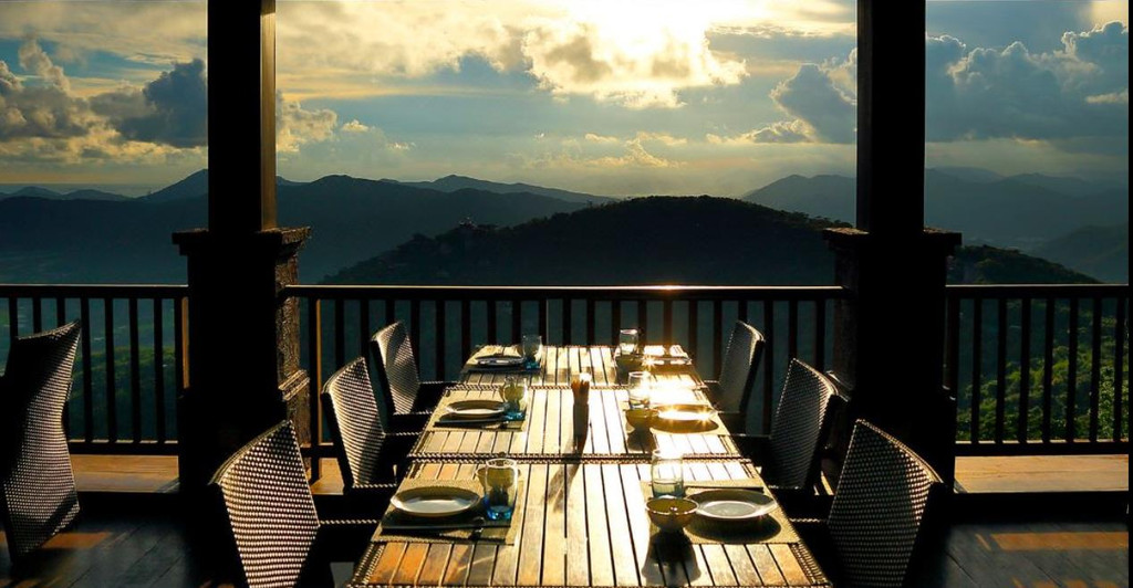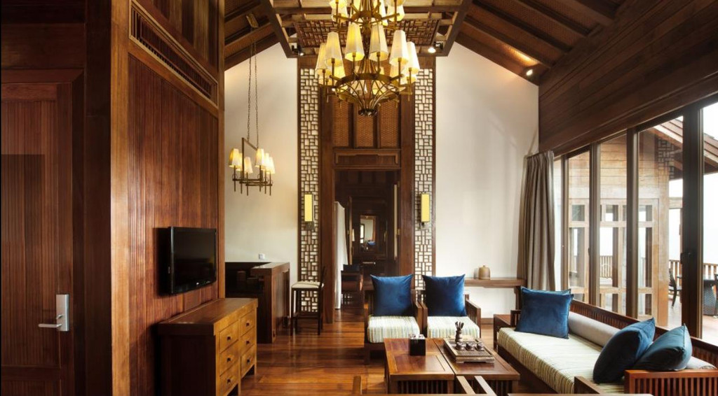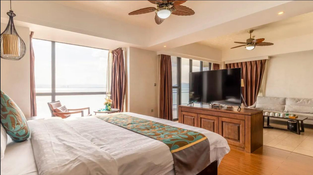 我们的房间是复式的,高高的落地窗就像是把窗外的山水镶在了画框中。