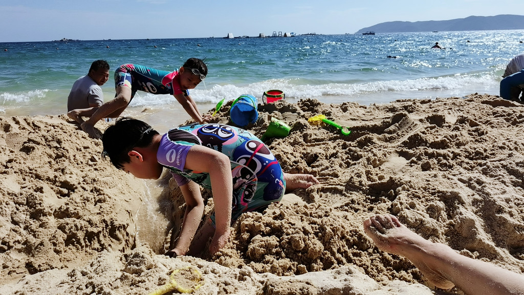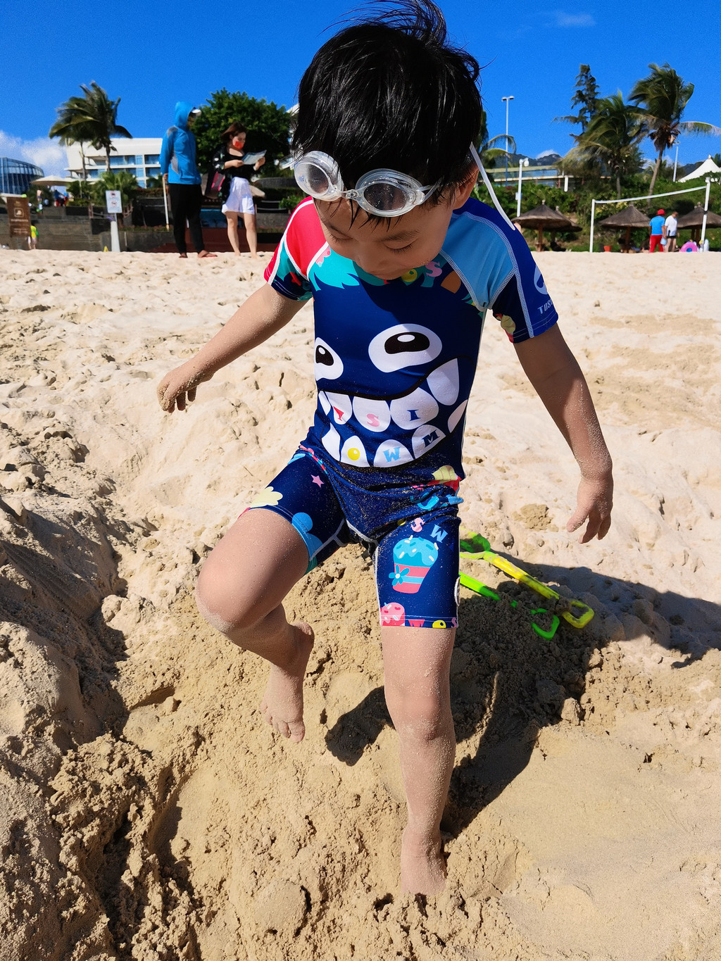 来来来,看看老二玩沙子一天的“见证”——腿上像穿了层丝袜。至于玩了几天之后的晒黑程度,就可想而知了。