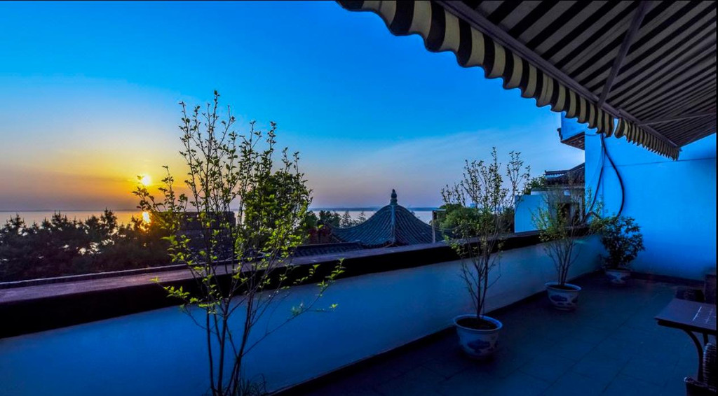 我们就住在岳阳楼景区大门的对面、也是洞庭湖畔——岳阳尚宿·月湖楼客栈(阳台湖景家庭套房) 。上图就是酒店房间阳台上拍摄的湖光夕阳。
