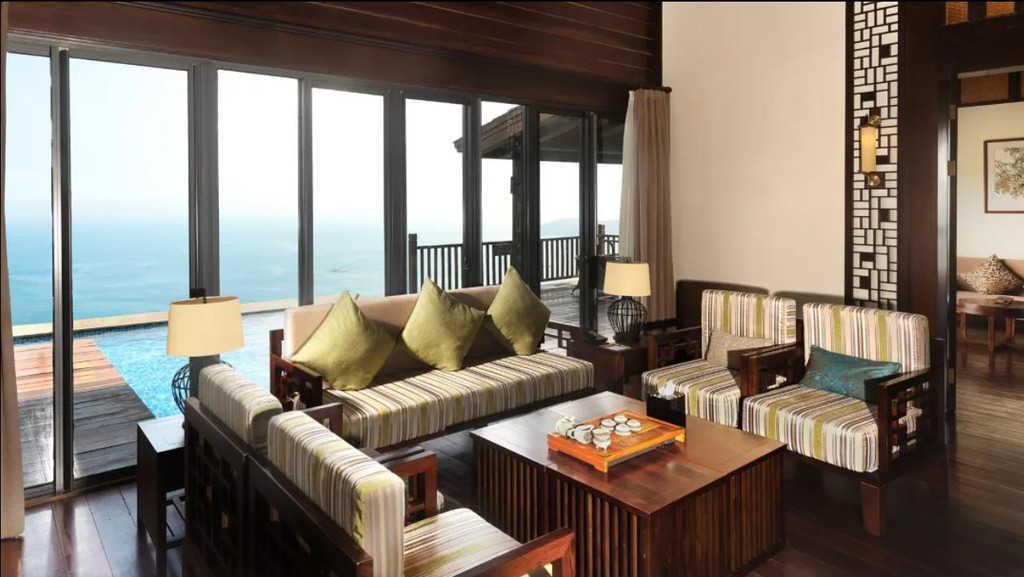 这个酒店就在亚龙湾热带天堂森林公园里,客房都是山间别墅的设计,错落分布在山间,有一部分客房是有海景的,所以这种林中观山海的感觉还是蛮特别的,它懂我的欢喜。