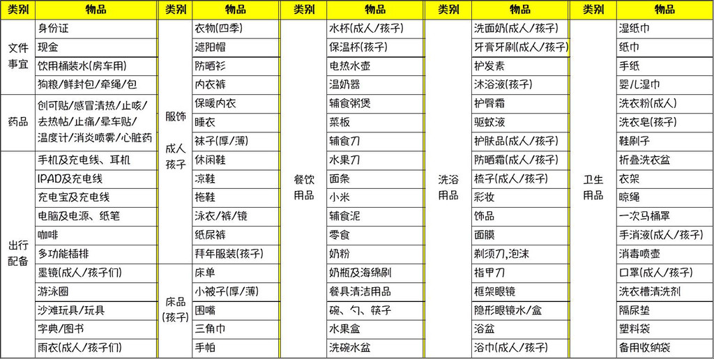 7、宇通530C的储物空间还是很大的,车内多个柜子,很能装;最重要的是比同级别房车的外部行李箱要大得多。除了杂七杂八的东西放进了多个储物柜里,车外左后侧行李箱放了2个28寸的大箱子,还有3个手提包;车外右前侧装了1个22寸的;驾驶位与副驾驶之间有很大的空间,又放了一个28寸的箱子;另外在副驾驶座位后面与沙发座之间也塞了一个22寸的——东西多得吓人吧,哈哈哈。附上我的物品清单一份(洁癖的原因,所以带的比较多)