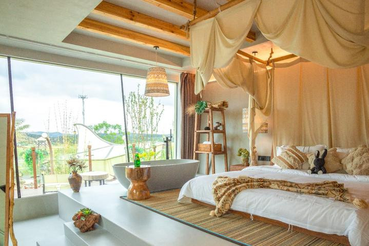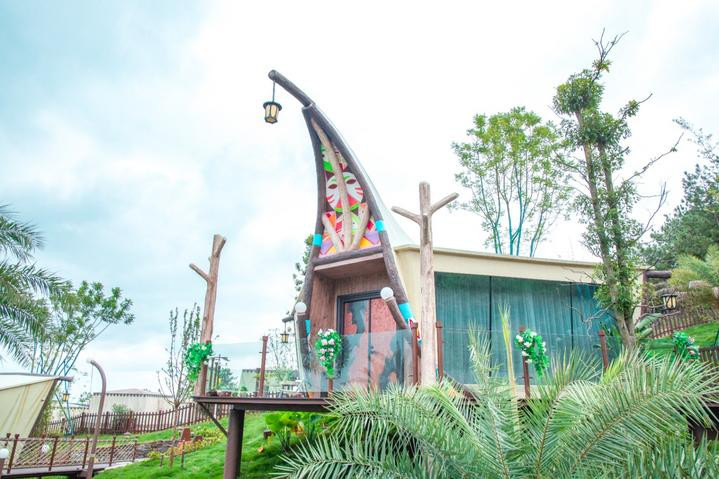 野奢风格的民宿近些年来非常流行,“野”意为选择一处风景致胜的地方,与自然相融合; “奢”应该是2层含义,一是说在物质上的奢华体验,一是说精神上感受奢华的艺术和美的品味。所以野奢风格的民宿总是给人一种高级、独一无二的感觉,可以说是一种民宿的潮流风向标吧。最近去木兰草原露营,发现草原新打造的巫傩部落民宿已经营业了,一直以来对这家民宿就带着好奇,一是名字巫傩部落就带着浓浓的神秘感,二是这家野奢风的民宿到底为什么值得2000多块一晚的价格呢?2个问题的答案我都找到了。巫傩部落,位于武汉黄陂区木兰草原景区里,高端轻奢型民宿,堪称是湖北民宿的天花板,它的名字“巫傩”就很神秘,部落又给人一种原始的感觉,引人入胜。巫傩文化确实是从远古而来,“傩”(nuó)意思是人避其难之谓,因此巫傩文化代表了人们趋吉避凶,崇尚美好的含义,而巫傩也有转运、祈求爱情、财富等美好的寓意。所以从宏观上来看这家民宿,整体布局类似于“雅典卫城”的感觉,8栋建筑是民宿的主体房间,每一栋都像飞鸟、帆船一般,星罗棋布于木兰草原的绿野之中,高大的棕榈树,成排的仙人柱,鲜艳的手绘图腾,走进民宿就好像走进了非洲原始部落一般,但深入其中,巨大爱心滑梯、野奢的露营装备遍布其中,给这里的浪漫又增添了一些童趣,处处让人惊喜。再来看看这8栋神秘的房屋,全部都是木质长廊来串联的,每一栋都是悬空地面的,据说这样做是为了隔绝潮气和灰尘。房间里有巨大的落地窗,可以无死角的观赏外面草原的景观,而且每一间入住和观景都互不打扰,使得我们在内部空间活动的时很有安全感,又不会影响大家在市内观赏风景,这个设计太贴心了。每一个房间都有一个文化气息浓郁的房名,名字取自《离骚》、《木兰辞》和巫傩文化典籍,分别是木兰兮、婵媛兮、芳草兮、婉婉兮、吉占兮、舞韶兮、桀鹥兮、先鸣兮。名字已然很高级了。然而走进房间以后,一室一厅的开阔格局让我眼前一亮,浓浓的波西米亚风情装饰,实木材质的家具,原木、藤编、棉麻等自然材质为主要材质,上等的床上用品,软装更是极具原始部落和现代时尚艺术气息,房间内还配备大浴缸、泡澡bubble球、马歇尔音响、戴森吹风机、成人和儿童的品质级洗浴用品等等。再说服务吧,走进木兰草原,就已经可以体验到巫傩部落的超级VIP服务了,每一栋都有一个专属管家哦,出行都有管家安排摆渡车接送,说白了,除了吃饭上厕所睡觉和自己玩以外,就可以两手一摊,好好在这个异域空间里,享受自己的野奢假期,民宿超级出片哦,多拍点自己的美照发朋友圈吧。如此这般的民宿,无论是民宿的颜值、设计、功能、硬件、软装、服务等等都可以说是天花板了,一晚2000多也值了。实用贴士:民宿:巫傩部落地址:武汉黄陂区木兰草原景区内交通:建议自驾娱乐:木兰草原景区旅游攻略导航