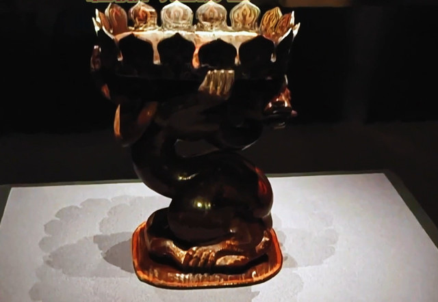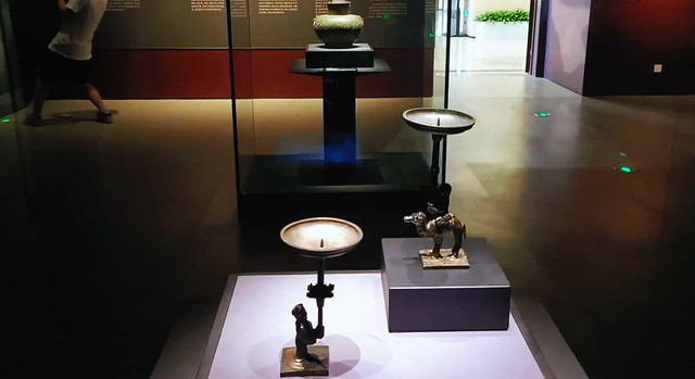战国时期的人骑骆驼铜灯展示了楚国与异域的商贸交流,铜人昂首直腰骑坐在骆驼上,骆驼头朝前伸,弓背垂尾,四足立于铜板之上,惟妙惟肖,无不体现了楚人的审美情趣和高超技艺。