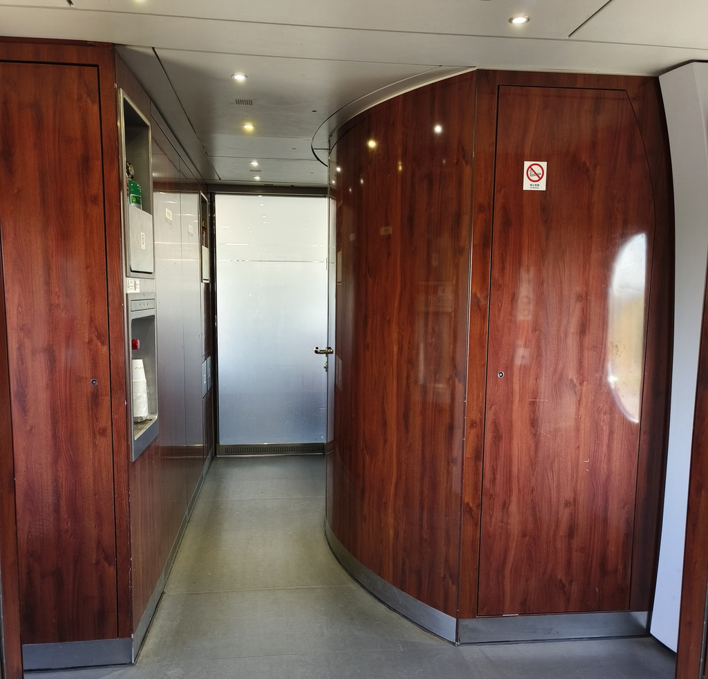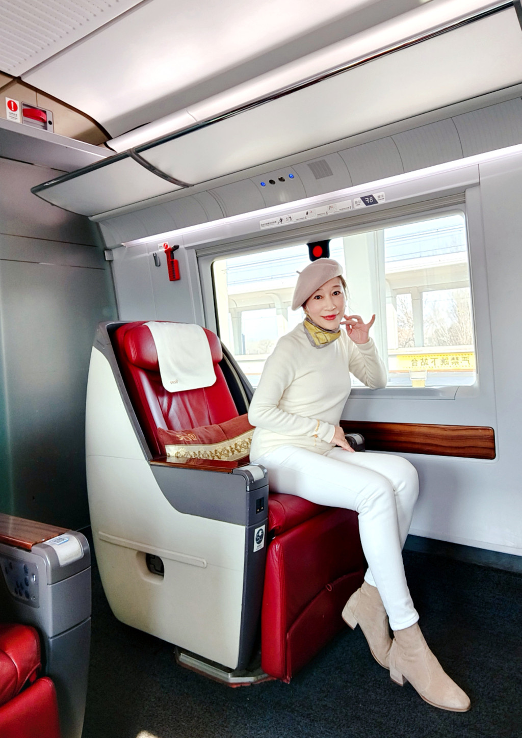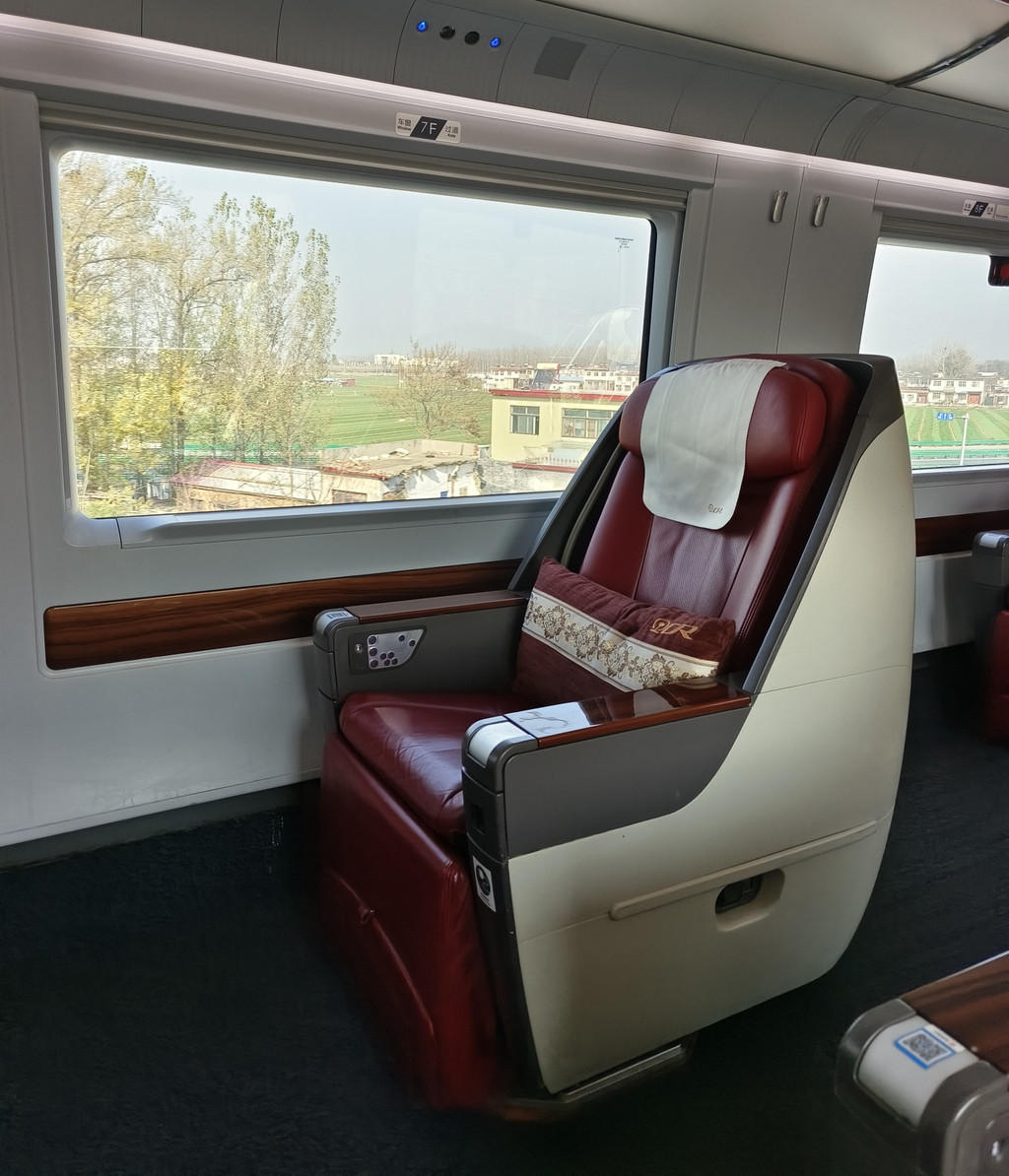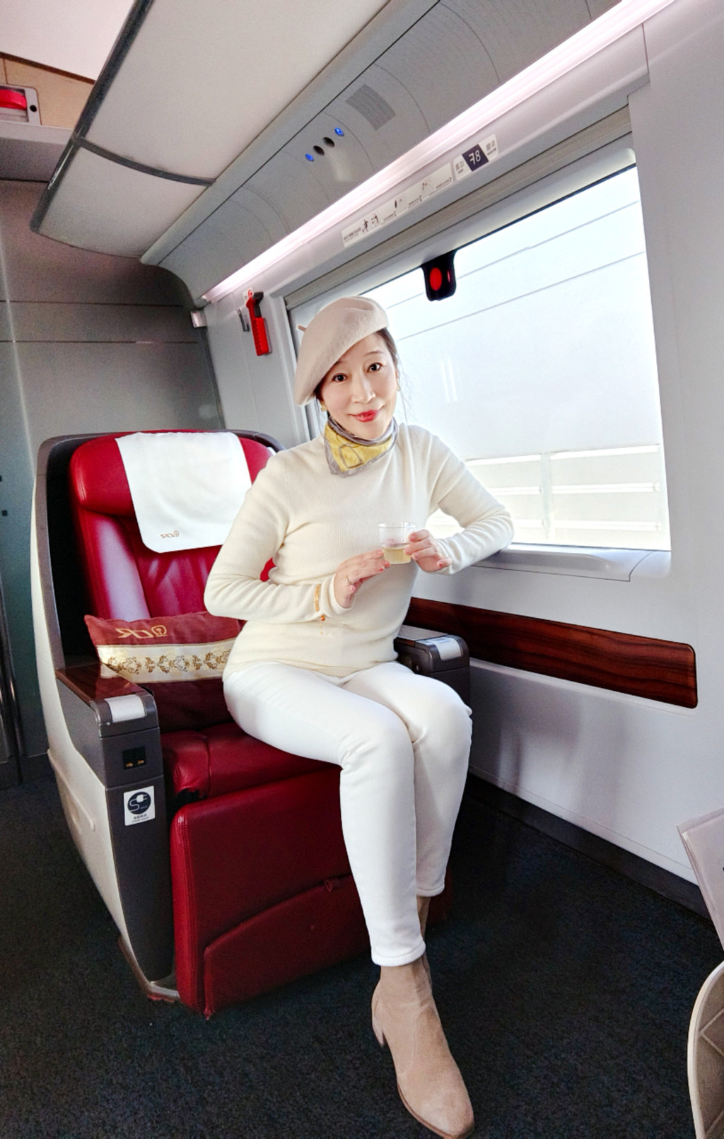 商务座候车室,是单独的进站和安检,不用和其他旅客相拥挤。着红色大衣的服务人员都是年轻漂亮的小姐姐,面带微笑主动帮忙拿行李上落过安检机,非常的热情友善。果然还是坐商务座十分舒适。其实之所以想试试这班的商务座,因为这班高铁的商务座车厢是第三节,感觉比较安全,大多商务座车厢都是在车头或者车尾呢。