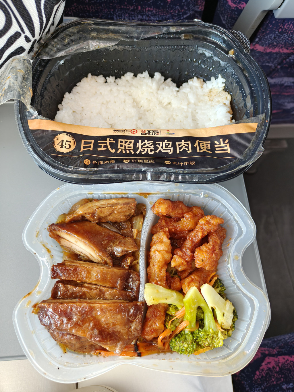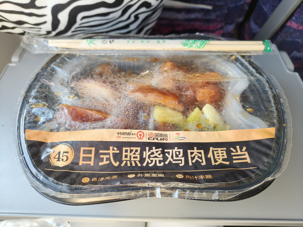 旅程的后半程更换到二等座,商务座免费的午餐可以打包带走。午餐是照烧鸡肉便当,挺好吃的。