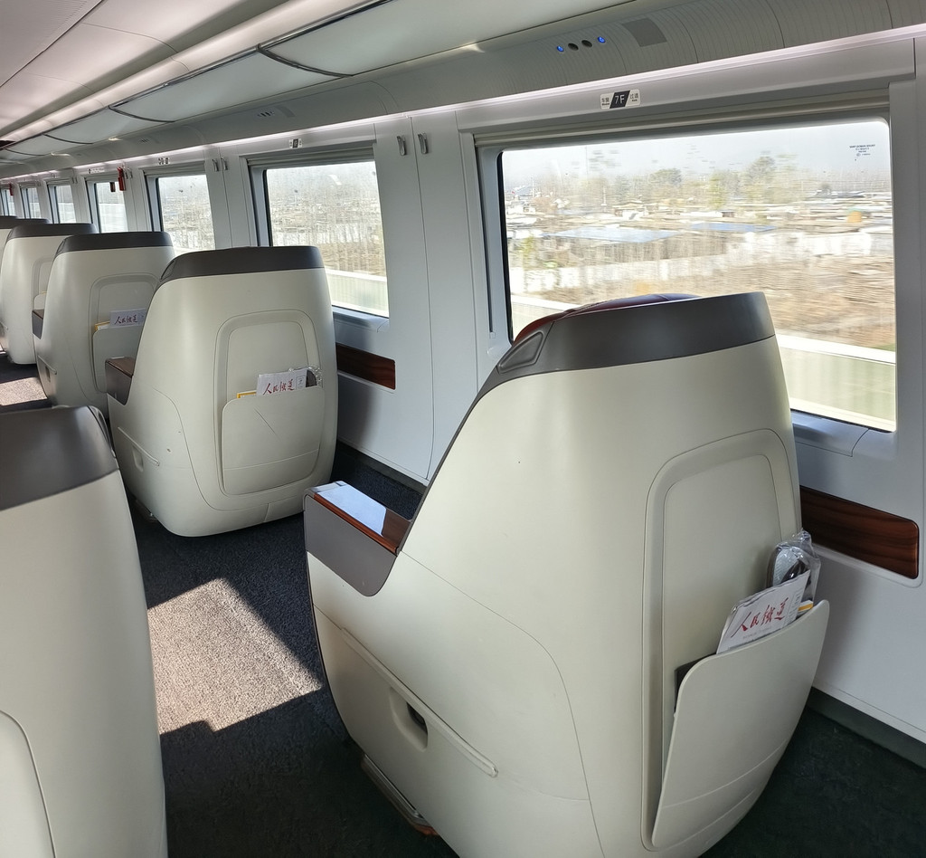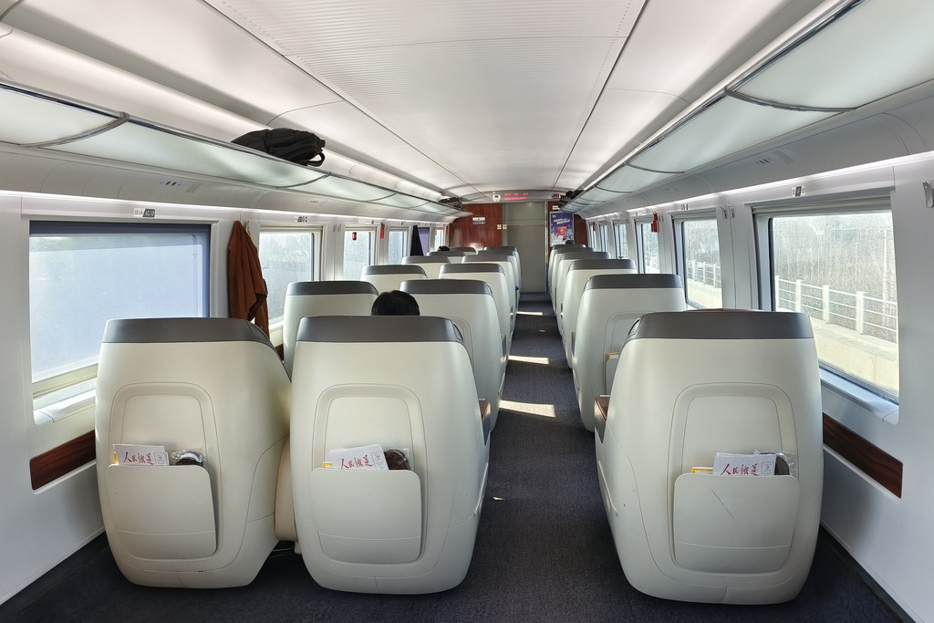 商务座也有好几位旅客,一开车列车员便开始统计午餐需要吃什么,没想到还有免费的午餐呢。商务座的列车员蛮漂亮,服务也非常热情细微。如果不差钱全程商务座真的是美极了,可以拍照吃零食还可以把座椅放平躺卧。座位很舒适,也很宽敞,行李也很容易堆放,就连一等座也无法相比。从商务座换到二等座,落差实在是太大了呢。商务座的票价比飞机头等舱都贵。但是也有个大缺点,几乎都在车头和驾驶室相连,为何不设置在中间呢?买票时可以选择,我坐的这班就是3车厢。