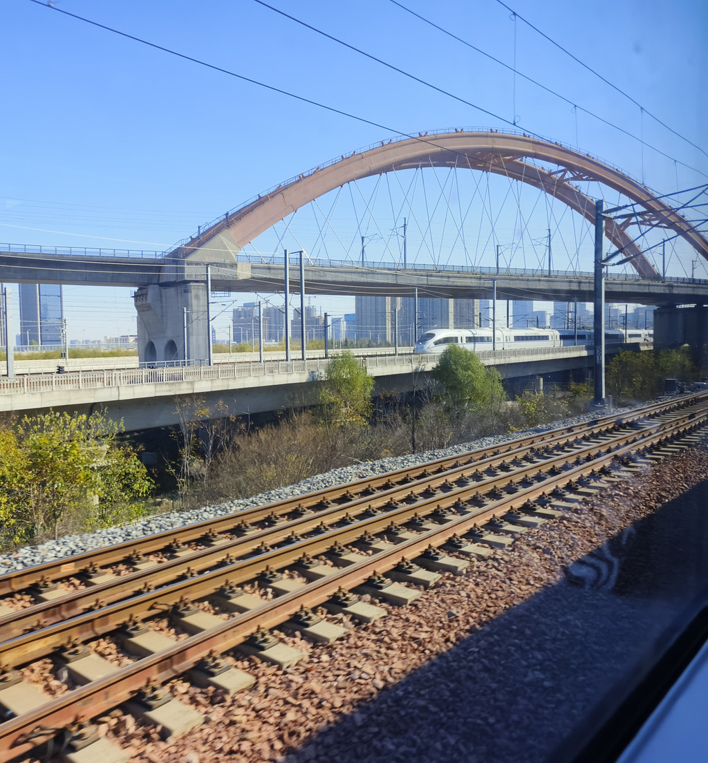 终于等到进站了,红色大衣的服务人员会提前给我们检票,并带领我们先进站到指定的站台,服务真的没说的。原先即使买的一等座也得和大部队乘客一起排队刷票进站,并且也不知所在的位置是哪。商务座票的优越性太棒了。列车徐徐进站,这趟车是青岛开来,终点站是广州南站。这班高铁是和谐号,看外表可以区分出来呢。和谐号是我国早期引进国外技术合成制作的,复兴号是后期我国自主研发的,设施应该更先进吧。远处那条桥上有人行道可以散步并观看火车呢。