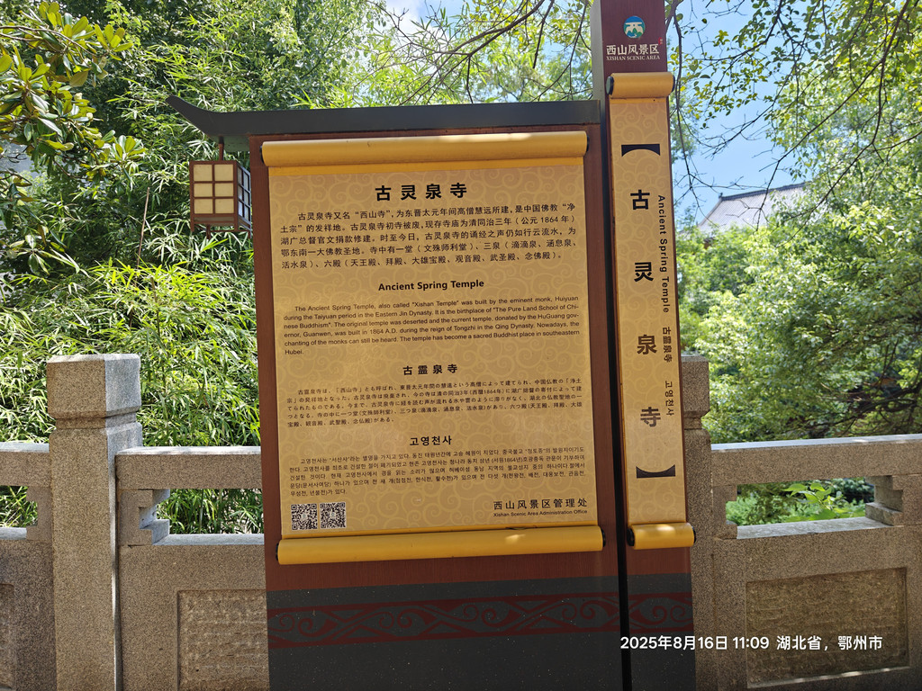 部分山路年久失修,石阶上布满青苔,对老年游客极不友好。景区内的指示牌虽然美观,却不够清晰,为了寻找秀园,我问了好多路人。更令人惋惜的是,古灵泉寺新扩建的部分与原有建筑风格脱节,钢筋混凝土的现代结构破坏了整体的古朴感。此外,景区内连个卖矿泉水的地方都没有。